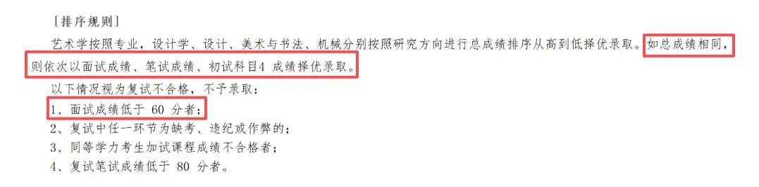 另外清华大学美术学院在去年的复试安排中,规定了总成绩排序规则:成绩相同的情况下,依次按面试成绩、笔试成绩、初试科目4成绩排序,再一次证明了面试的重要性。
