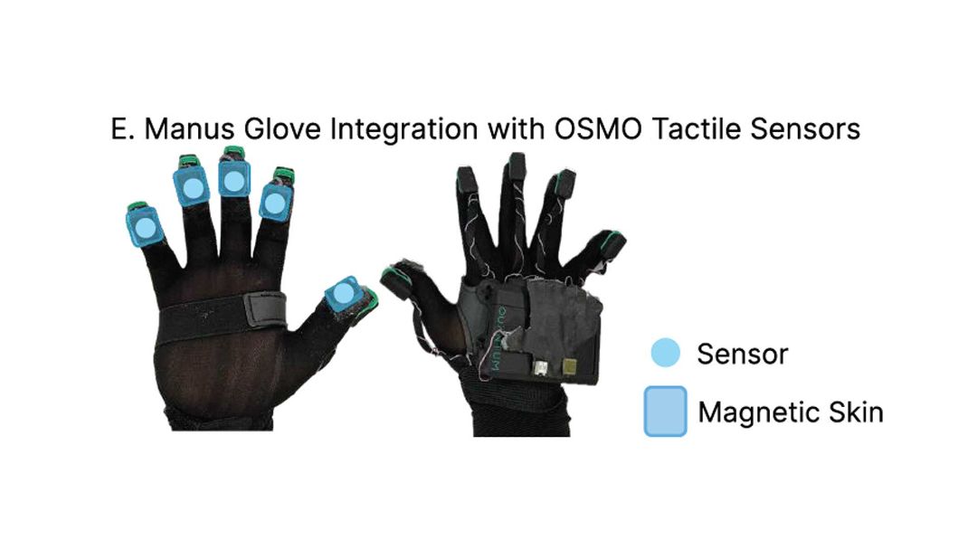 MANUS Metagloves 手套可提供不依赖于摄像机可视性的直接手指关节感测,提供干净的关节水平运动学而不会限制人类双手的自然灵巧性,并且可在不干扰OSMO磁性触觉传感器的感测频率下操作。这种组合确保了在遮挡情况下连续和准确的手姿态跟踪,实现了手部运动和触觉力之间的可靠对准,并使得触觉驱动的人到机器人的技能转移更加实用和稳定。