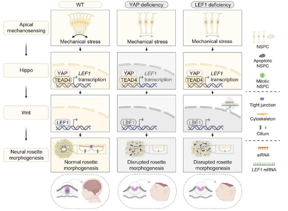 近日,Science China Life Sciences(《中国科学:生命科学》英文版)在线发表中国科学院动物研究所刘光慧研究员团队、首都医科大学宣武医院王思研究员团队和中国科学院动物研究所曲静研究员团队合作题为“Mechanosensor YAP Orchestrates Human Neural Rosette Morphogenesis via TEAD4–LEF1 Transcriptional Nexus”的研究论文。该研究从机械生物学与转录调控的交叉视角,系统揭示了YAP作为机械传感器在人类神经管形态发生中的核心作用,并提出了“YAP–TEAD4–LEF1”调控轴线作为神经管缺陷(如无脑畸形)潜在干预靶点的重要意义。