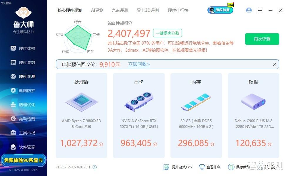 ▼整机配置一览,处理器是9800X3D,显卡是RTX 5070 Ti,硬件配置很不错了。