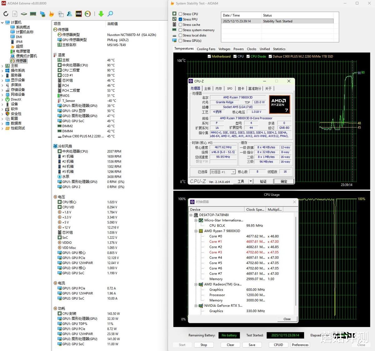 ▼单烤FPU测试,处理器功耗在145W左右,全核心睿频4.7GHz,温度90℃,南桥46℃,供电51℃,显卡核心39℃,固态45℃。