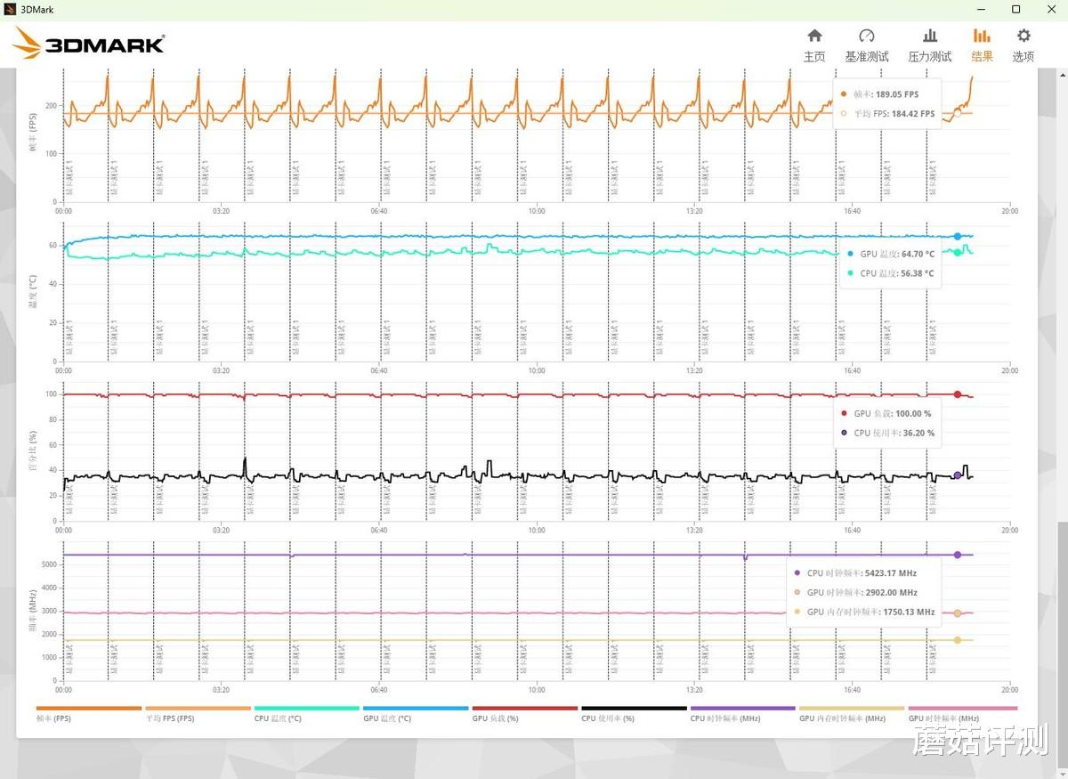 ▼显卡的核心温度在64.7℃,处理器温度在56℃左右,散热表现不错。