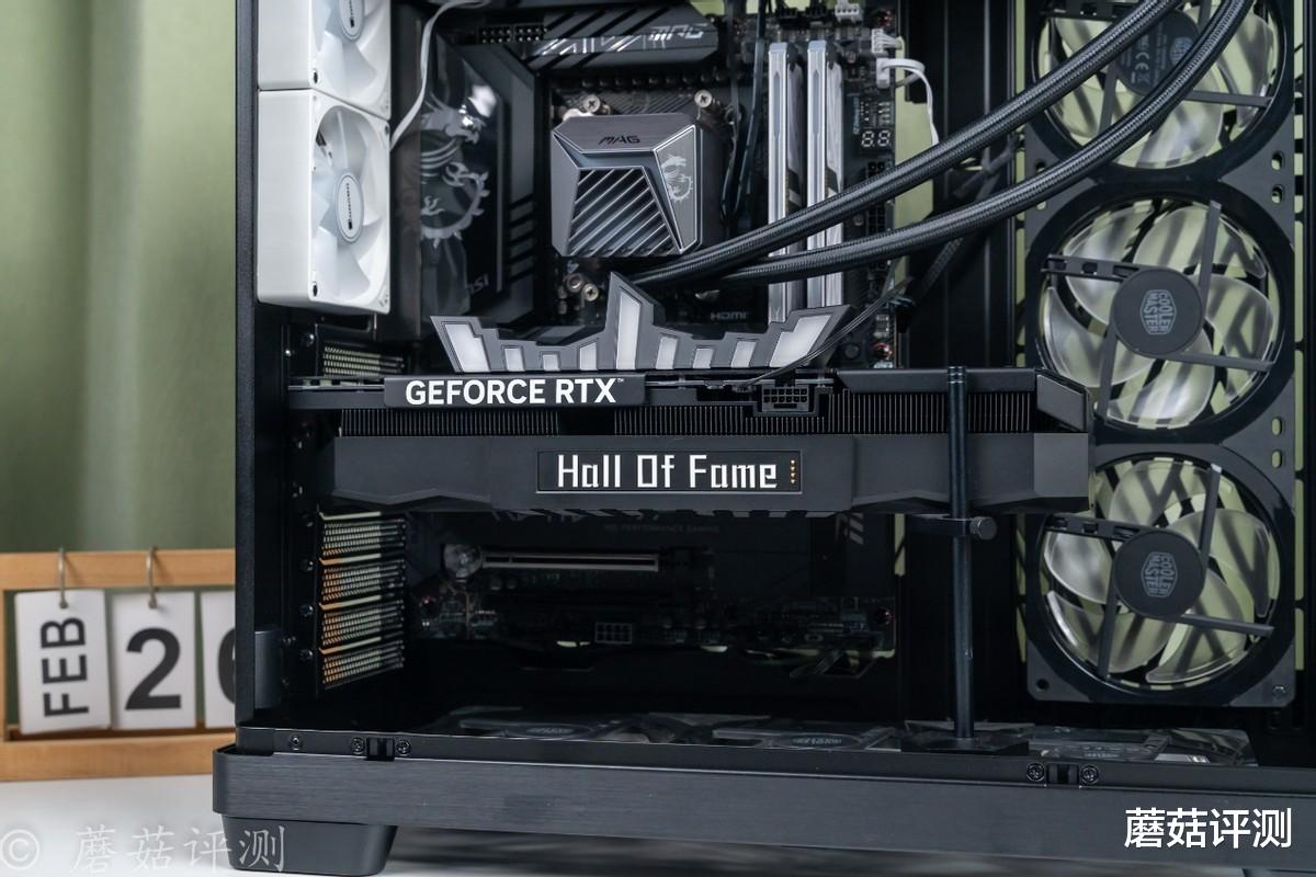 ▼显卡背面的金属背板涂装也是非常复杂,中间是影驰经典的HOF皇冠LOGO,顶部的那个小皇冠还支持ARGB灯效,设计拉满。