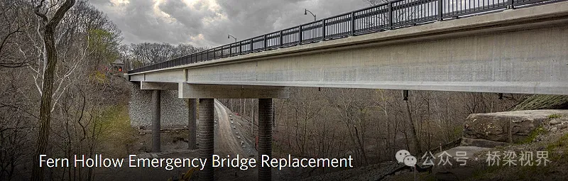 在改造项目的演讲与采访中,工程师和业主单位普遍提及"桥梁快速施工技术的应用",其中,工期最为紧迫的两个项目分别是 Fern Hollow Emergency Bridge Replacement和 Higgins Avenue Bridge Rehabilitation,照片如图。前者为全美瞩目的塌桥事故修复工程,后者为当地民众关注的对老城区桥梁的加固改造工程,都要求8周内高质量解决问题。