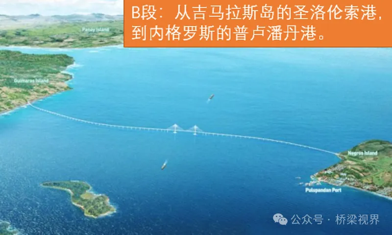 该项目分为两段,全长32.47公里,总造价30亿美元。A段连接班乃岛至吉马拉斯岛,全长13公里,大部分为岛上高架,跨海桥梁实际长度约4公里,将于2028年6月30日交付,造价约10亿美元;B段连接吉马拉斯岛至内格罗斯岛,全长19.47公里,其中16公里以上为跨海桥梁,需要海上施工,作业难度较大,交付时间预估为2032年6月30日,造价约20亿美元。