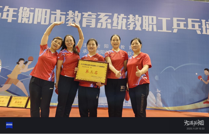全力挥拍展激情,挥洒汗水铸辉煌。2025年11月9日,衡阳市教育系统乒乓球比赛圆满落幕,衡阳市第七中学代表队凭借出色的团队协作和顽强的拼搏精神,在众多强队中脱颖而出,最终斩获团体赛第二组季军,为学校赢得荣誉。