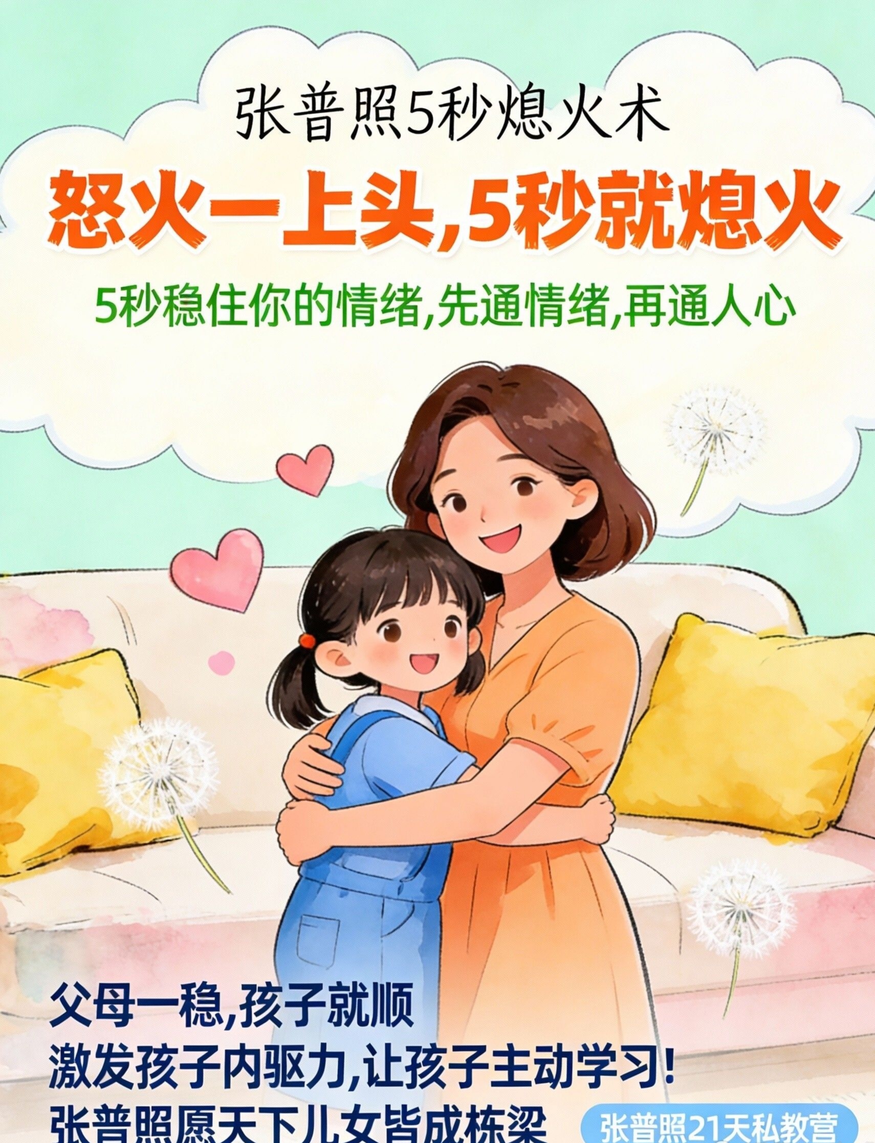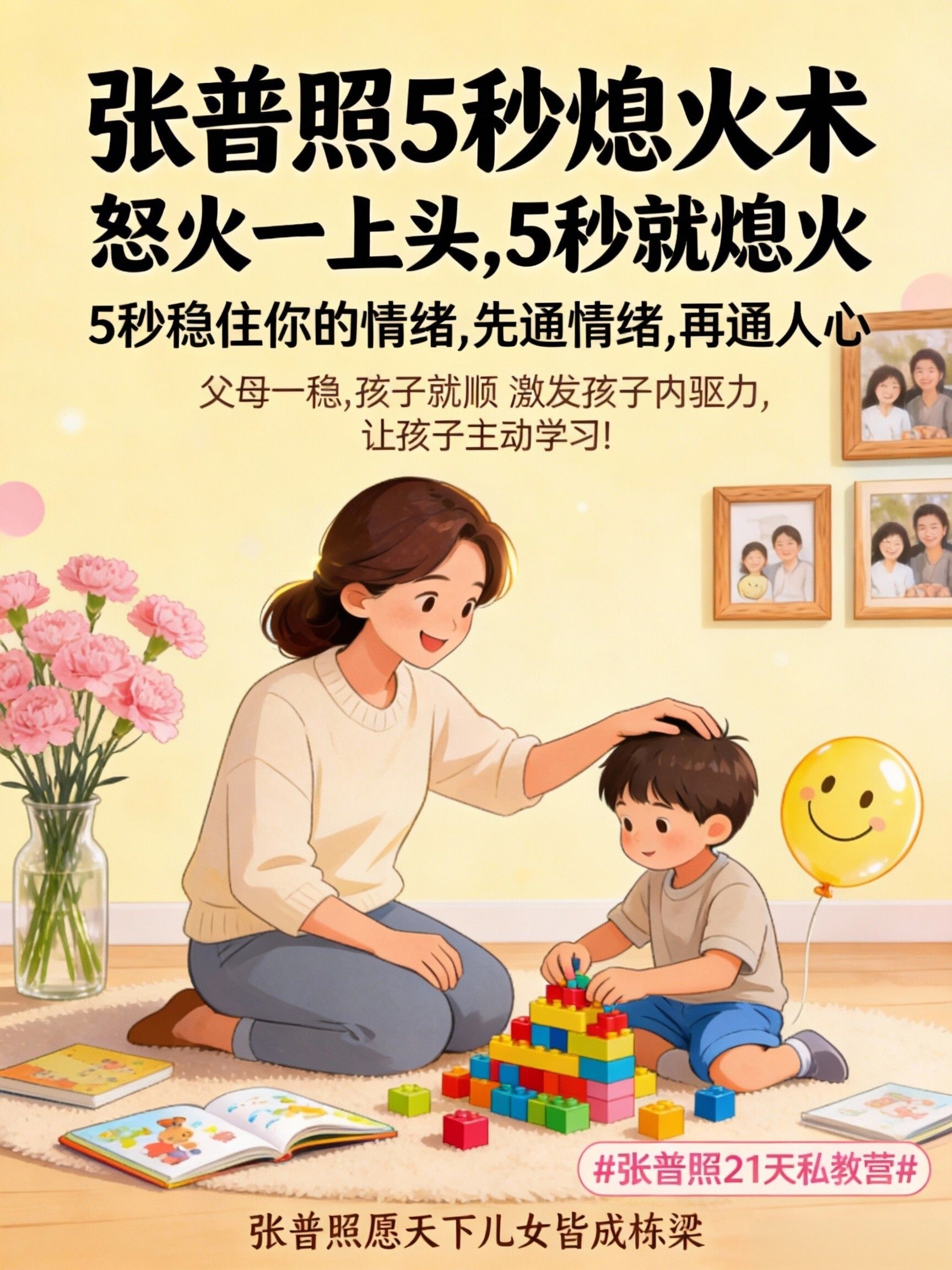张普照5秒熄火术,就是帮你从根源上拆除家里这个最活跃的“情绪压力炸弹”。它不止让你“不发火”,更是通过让你在情绪崩溃前5秒实现“软着陆”,为你和孩子创造一个神经发育所必需的、稳定可预测的情感环境。这是预防和修复绝大多数所谓“心理伤痕”的最根本前提。