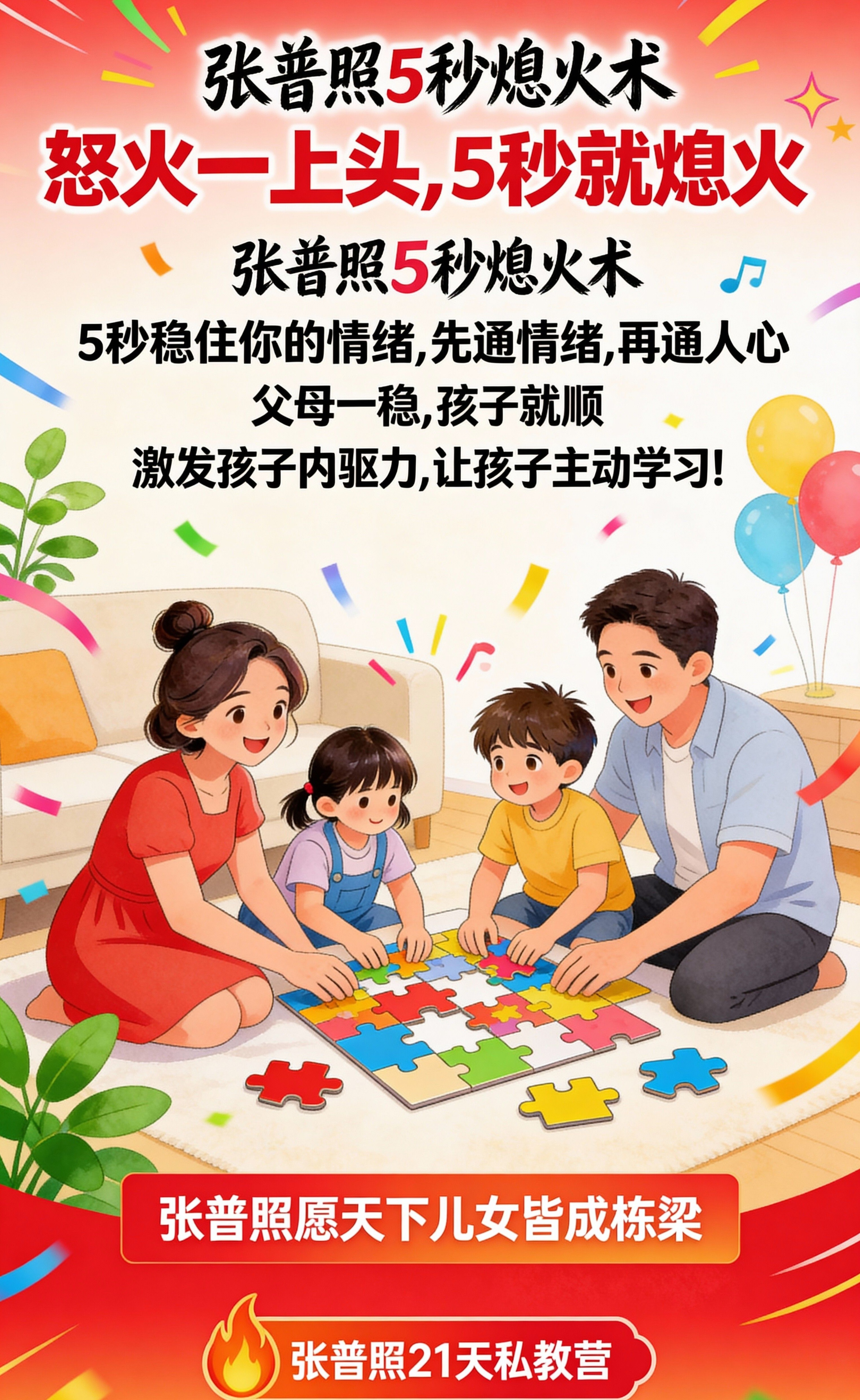更重要的是,一旦您掌握了 ‘张普照5秒熄火术’ 这个治本之策,您就握住了化解孩子情绪崩溃、厌学拒学、人际困难、自卑敏感以及阻断心理问题代际传递等一系列困局的万能钥匙。