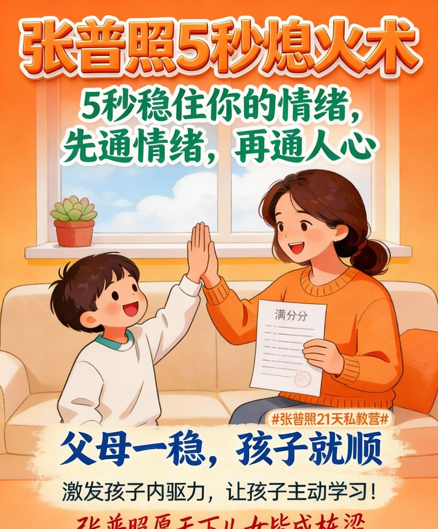 张普照5秒熄火术,就是让你获得这种 “情绪无菌室”营造能力的核心心法。在你即将被孩子的“问题行为”或自己的焦虑压垮,准备做出加剧伤害的反应的那个致命5秒,给你一次从“压力源”到“安全港”的瞬间切换。妈妈先通过5秒熄火术,把自己变成家里最稳定、最可预测的安全基地,孩子的“创伤”才有了被疗愈的土壤。