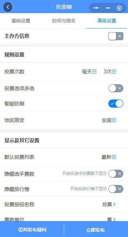 设置活动时间、投票规则(如:每人限投3票、每日限投1次)、防刷票机制等;
