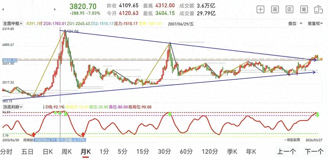 进入2026年,开年位置并不算低,期间也确实有波动,3月份最低一度下探到3794点,看着挺吓人。但您细看,就在3月底,指数一个低开精准回踩到3850点附近(就是前面说的那条“牛熊分界线”转变而来的新支撑位),随后立马被资金强势拉了回来。这就叫“该跌不跌,理应看涨”。这个动作明确告诉我们两个事:第一,年内的低点3852点附近有铁底支撑,空头砸不下去;第二,市场的重心始终保持在年内开盘价之上,多头依然牢牢掌控着中期节奏。