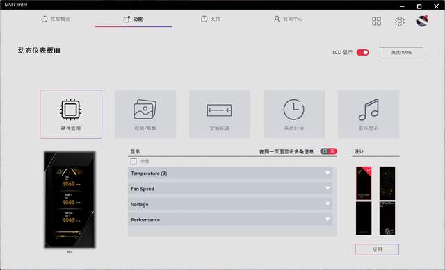 通过MSI CENTER可以对屏幕主题进行高度自定义,最基本的功能就是实时展示硬件运行信息。
