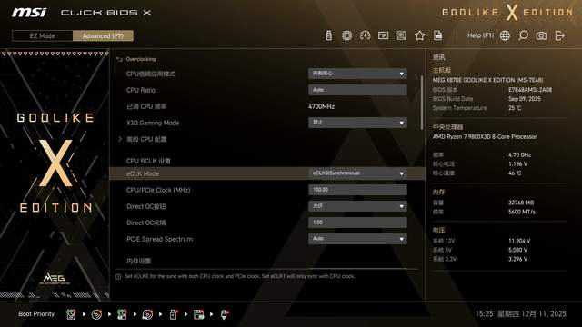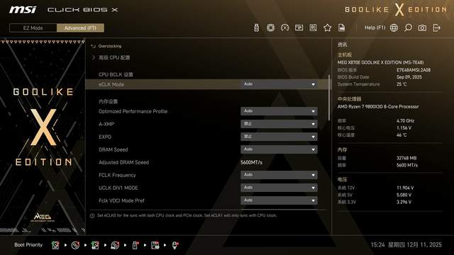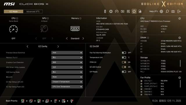 微星MEG X870E GODLIKE X EDITION主板有专属的BIOS界面,右上方有专属的“X”Logo。EZ MODE界面直观且清晰,容纳的信息量也相当多,无论是超频设置、硬件监控还是系统优化,都能快速定位并调整。