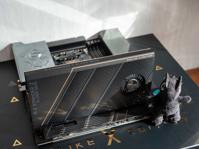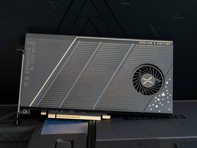 首先是左下角的M.2扩展卡——M.2 XPANDER-Z SLIDER GEN5,简单来说就是一个PCIe转M.2接口的转接卡。从接口可以看出来,金手指有X8长度,也就是说它可以转接两个PCIe 5.0x4通道的M.2固态。