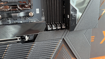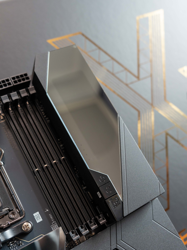 至于M.2插槽,那就是大满配了:提供5个免工具快拆且有装甲覆盖的M.2插槽,其中首槽不仅走的PCIe 5.0x4通道,还搭载加厚版本的堆叠式散热装甲。
