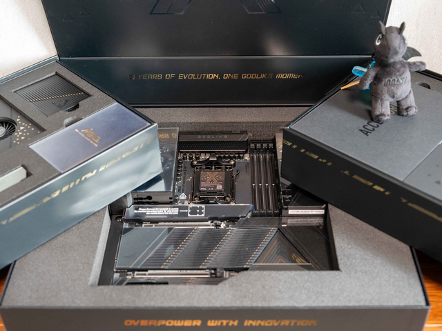 右边配件箱还有线材以及鲨鱼鳍WI-FI天线就不赘述了,毕竟这开箱环节已经惊喜不断。左右推开两边的配件箱之后,微星MEG X870E GODLIKE X EDITION主板终于露面。