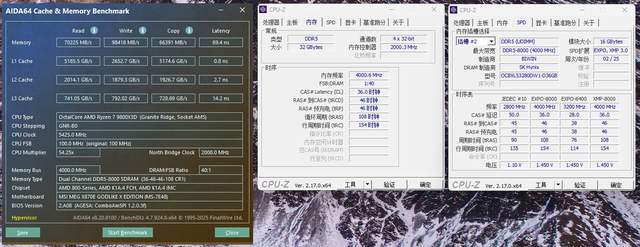 AIDA64测试,开启微星内存黑科技后,读取速度为70225MB/s,提升5.9%;写入速度为98418MB/s,提升9.8%,延迟大幅降低至69.4ns。