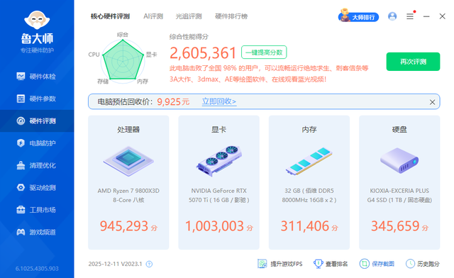 娱乐大师测试,内存得分311406,综合得分2605361,击败全国98%用户。