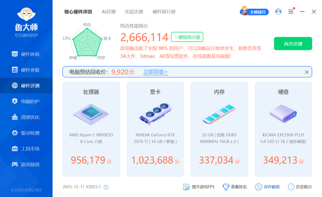 娱乐大师测试,处理器得分956179;内存得分337034,提升8.2%;综合得分2666114,提升2.3%,击败全国98%用户。