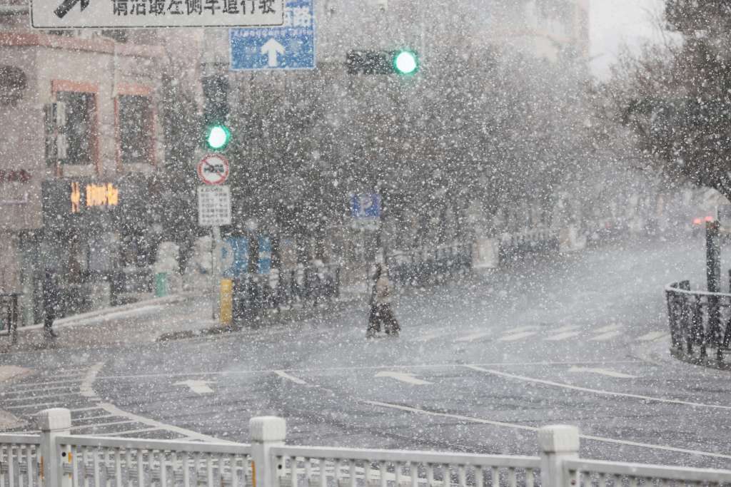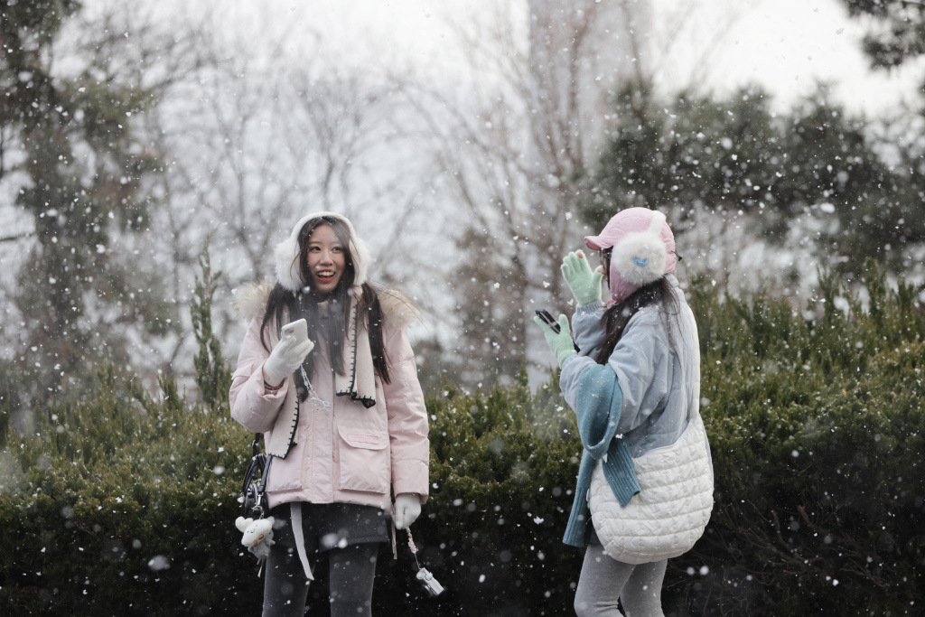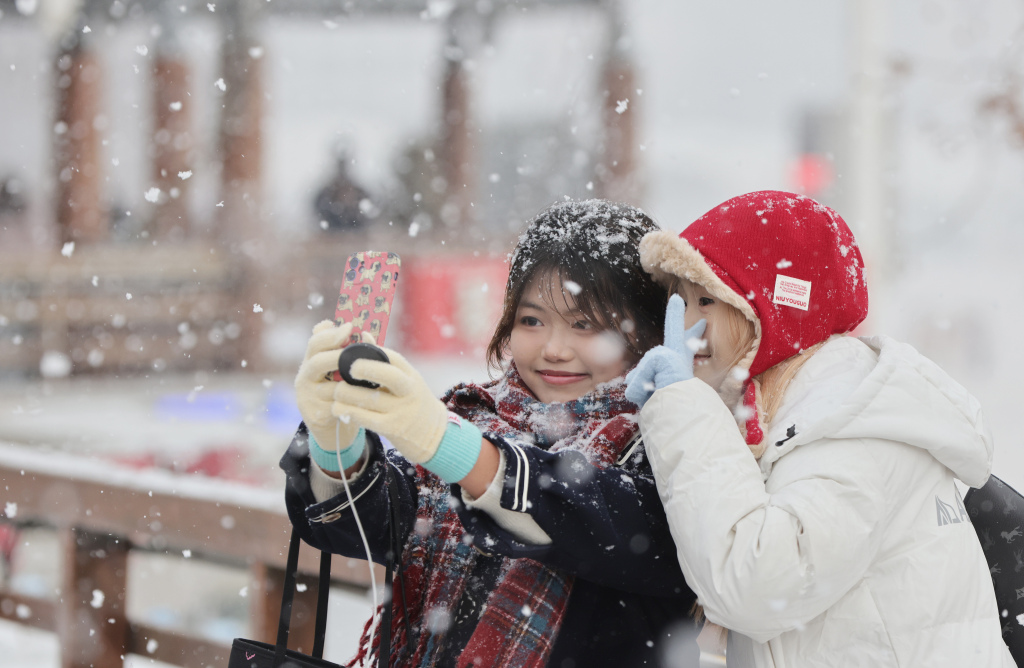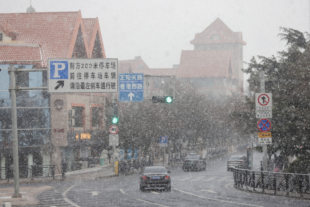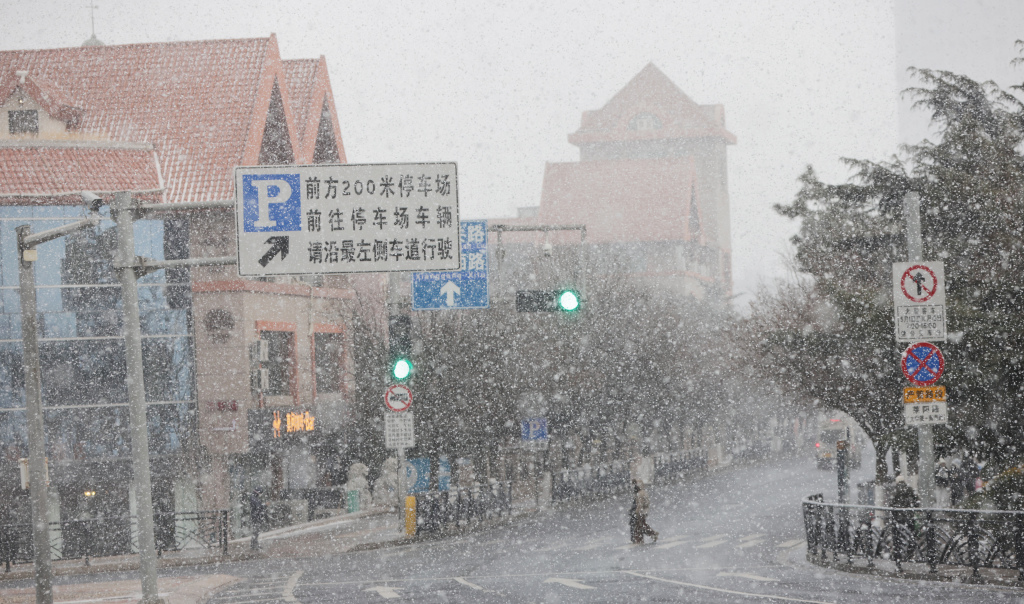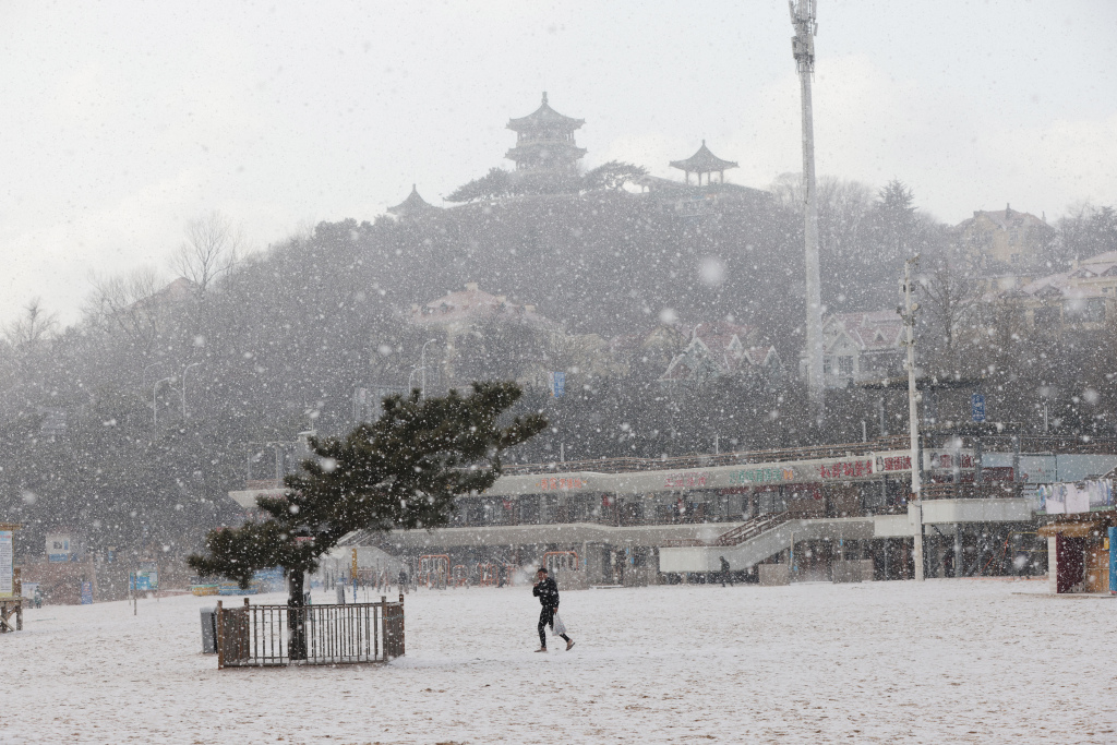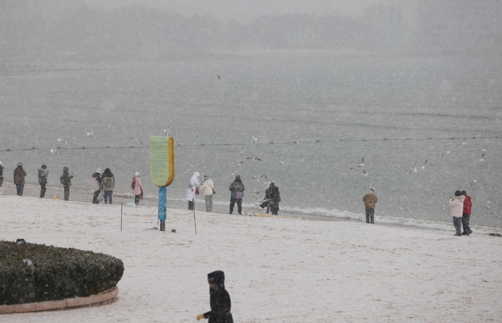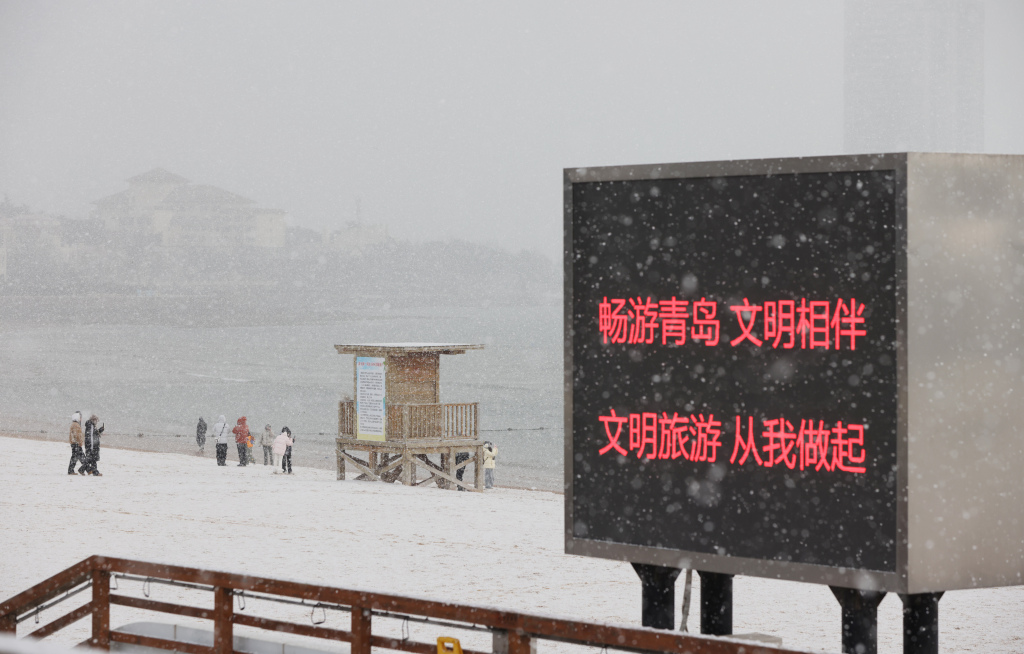 1月20日,青岛下起了大雪,一些在海边的游客看到鹅毛大雪十分开心,纷纷拿出手机定格这美好的瞬间。