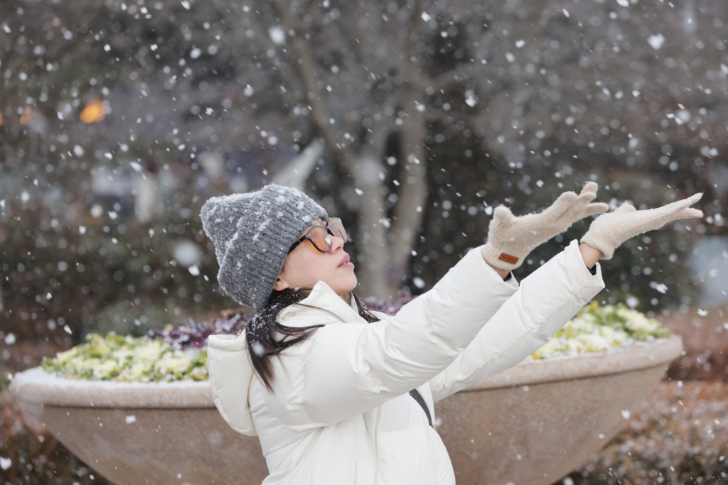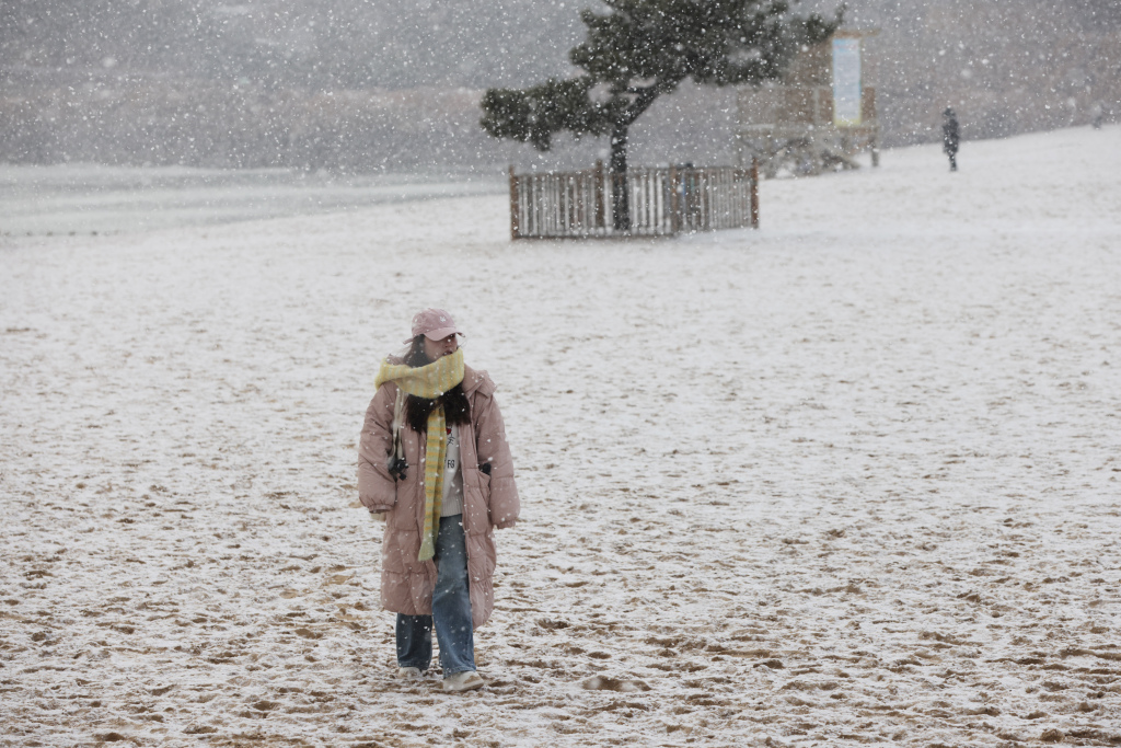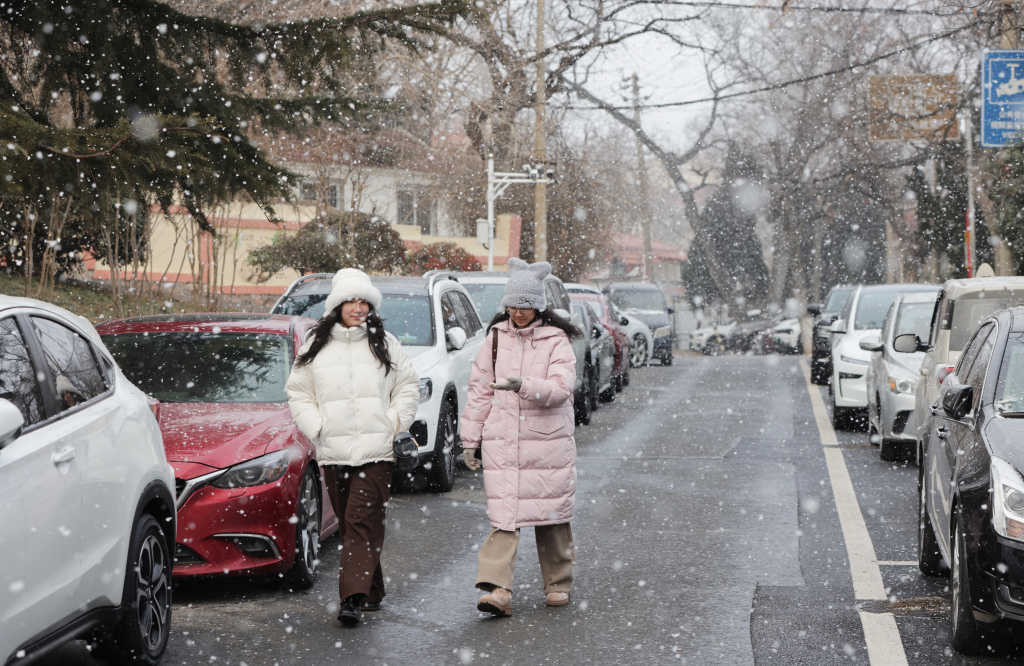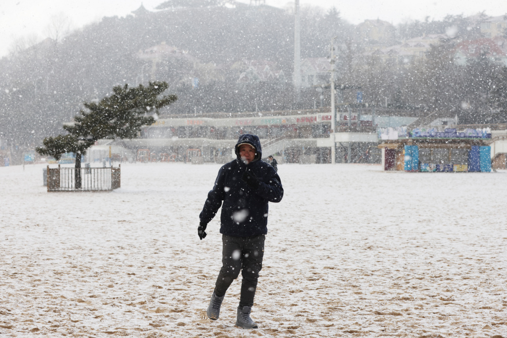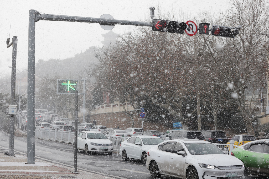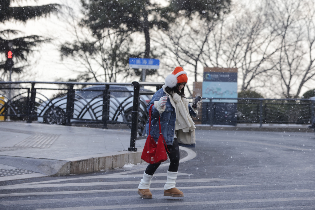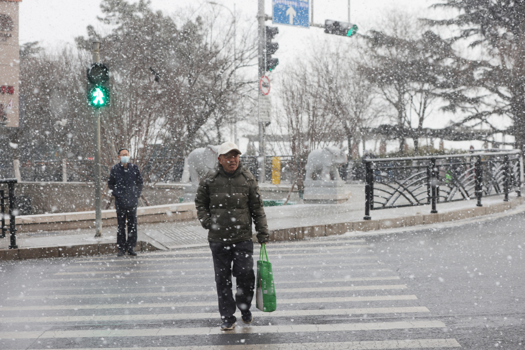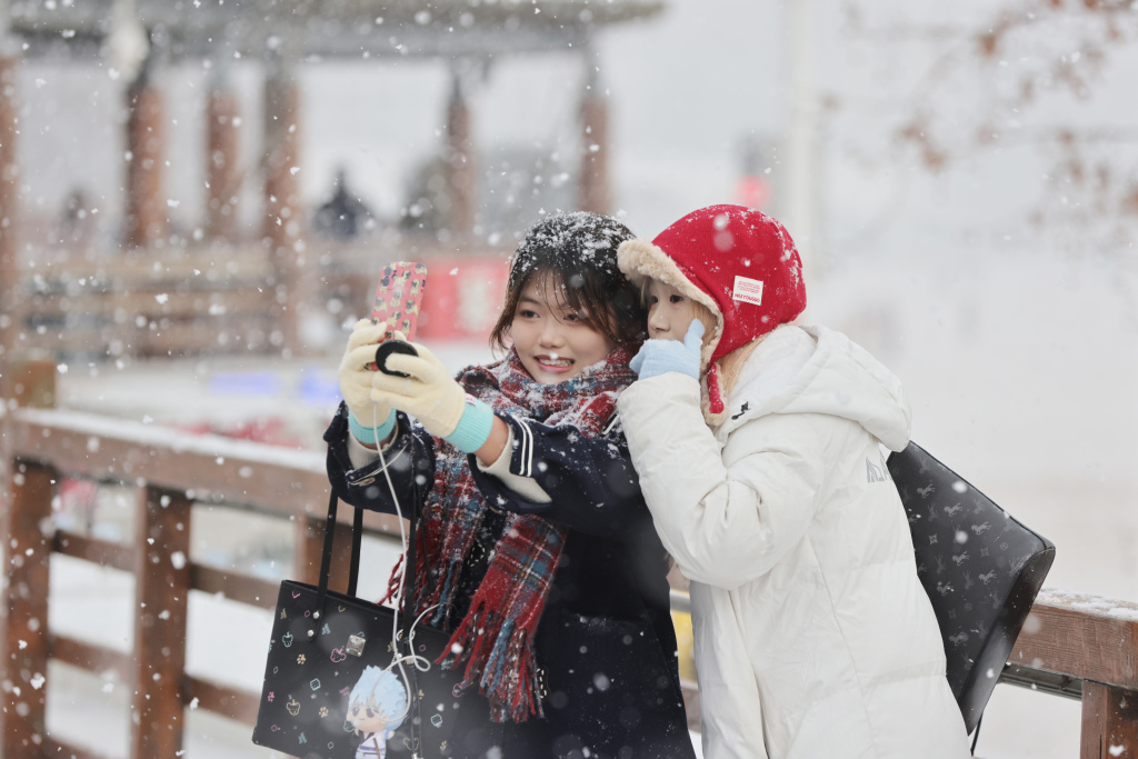1月20日,青岛下起了大雪,一些在海边的游客看到鹅毛大雪十分开心,纷纷拿出手机定格这美好的瞬间。