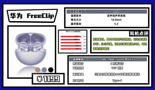 延迟表现良好,看视频或轻度游戏几乎不存在声画不同步问题。续航可靠,支持快充,短时间即可恢复大部分电量,日常使用无需频繁充电。考虑到 1199 元的售价,FreeClip 更适合深度华为生态用户或对设计与使用体验有较高要求的用户入手。