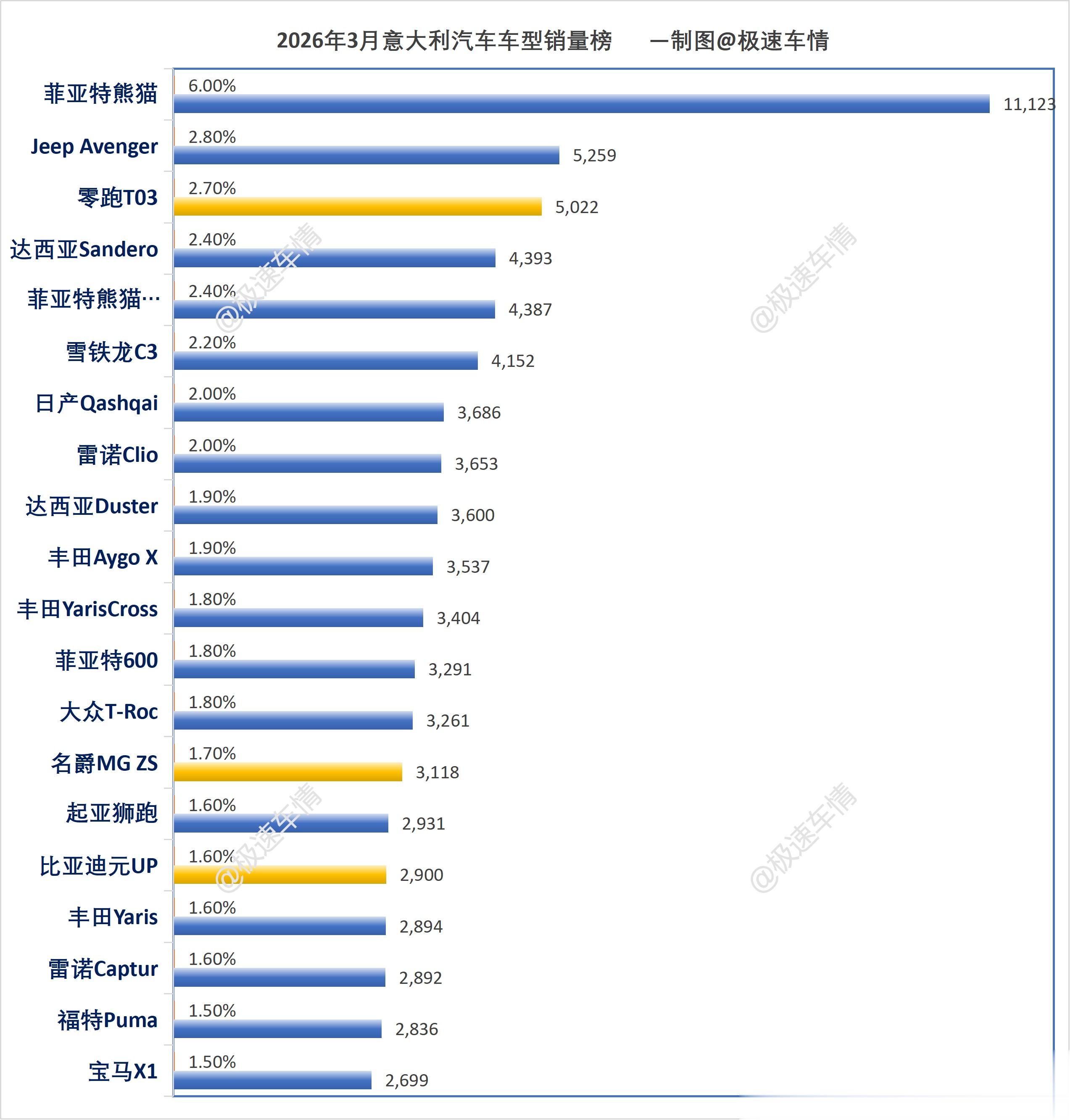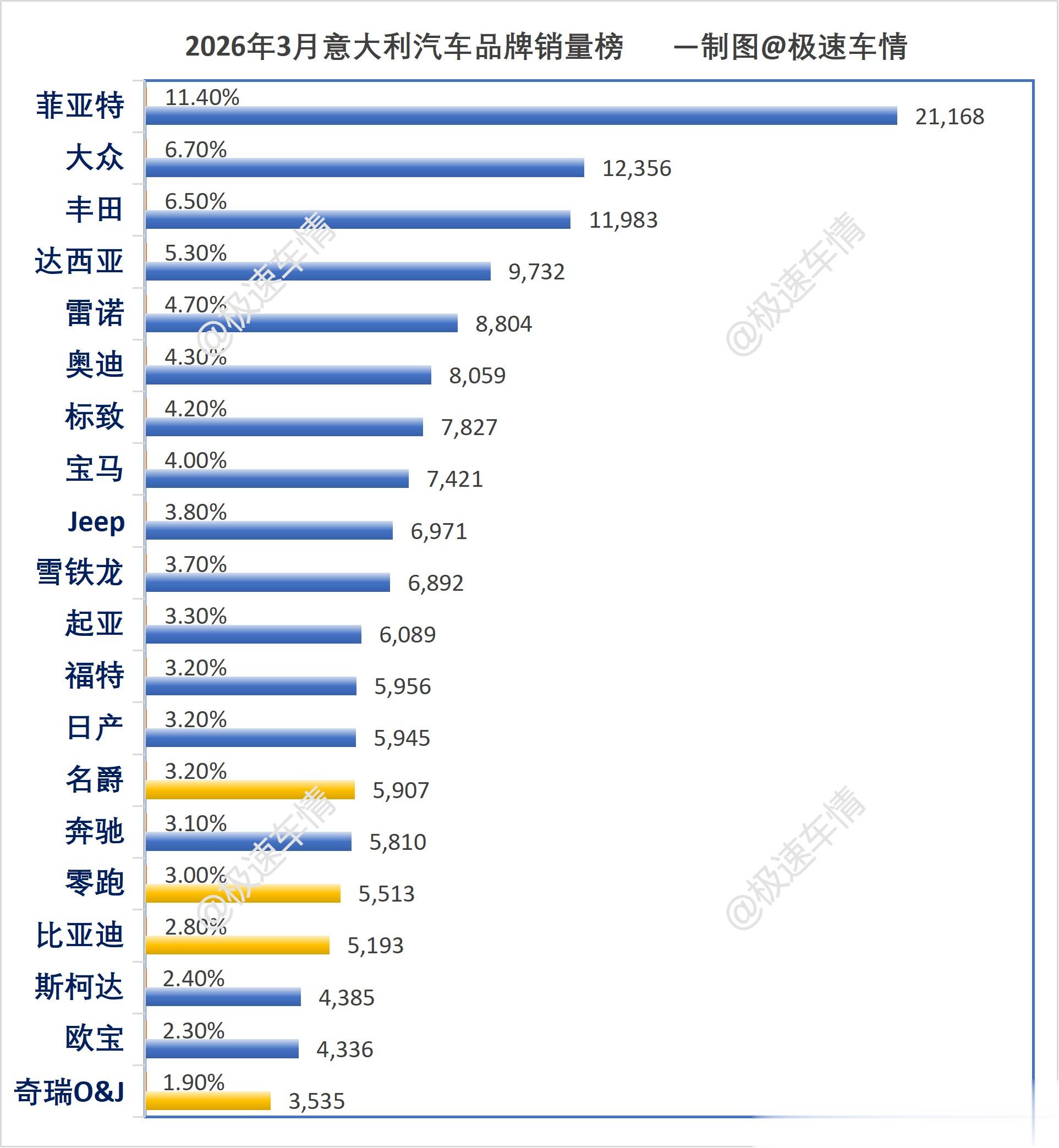 大家好,这里是极速车情。今天为大家带来意大利汽车市场2026年度2月份的品牌销量数据报告。