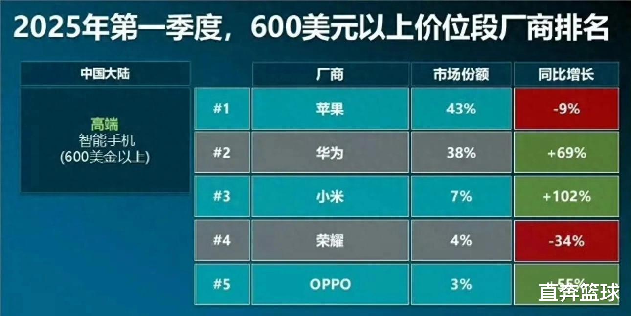 其实今年的机圈市场和新能源汽车市场一样,都是相当残酷的竞争机制。但是高端手机的分比并没有发生太大变化,根据最新发布的2025年第一季度,600美元以上价位厂商排名,苹果以43%的市场份额遥遥领先,在中国市场占据了最大的蛋糕。