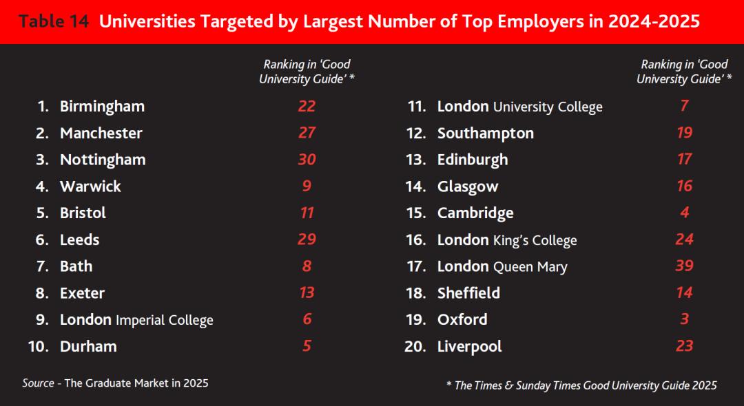 在2024-2025年度最受雇主青睐的大学排名中,伯明翰大学继续位列英国第一,曼彻斯特大学、诺丁汉大学、华威大学和布里斯托大学分别位居第2-第5名。