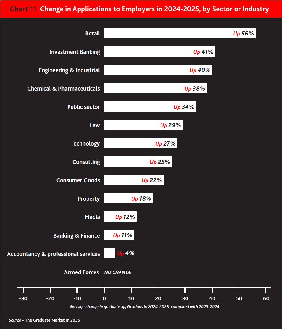 2024-2025招聘季,英国百大雇主收到的毕业生申请数量同比增加28%。其中,零售业、投行、工程、化工与公共部门的申请增幅最大,不少雇主申请量 翻倍。这意味着毕业生面对的竞争比往年更为激烈。