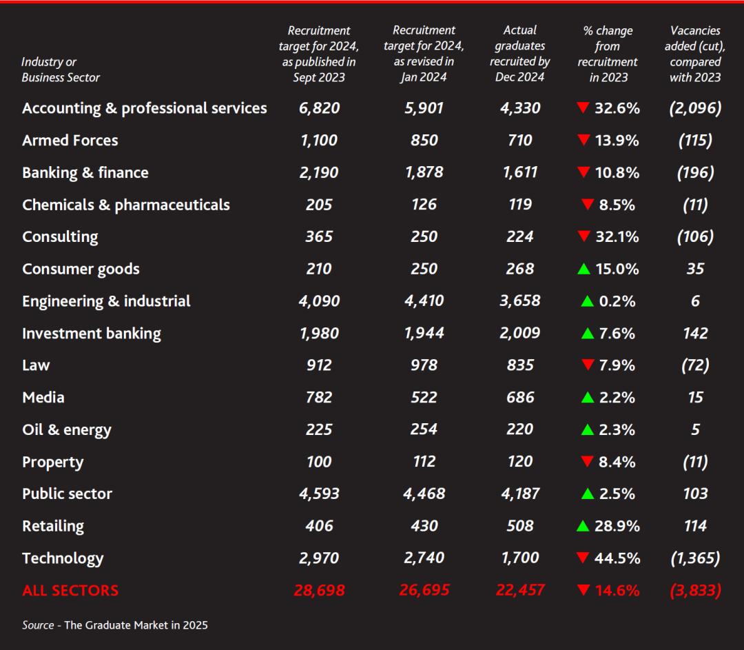 英国百强雇主的毕业生招聘持续收缩。2024年,招聘岗位骤减14.6%,约6,000个职位被削减,创下自2009年以来的最大年度降幅。