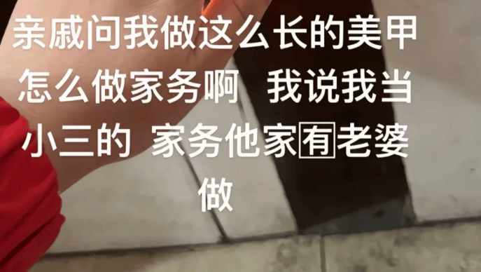 年初有个很火的挑战#亲戚问我美甲这么长怎么干活#,很多人跟风文案“当小三的,家务有他老婆做”,这何尝不是一种自我矮化?