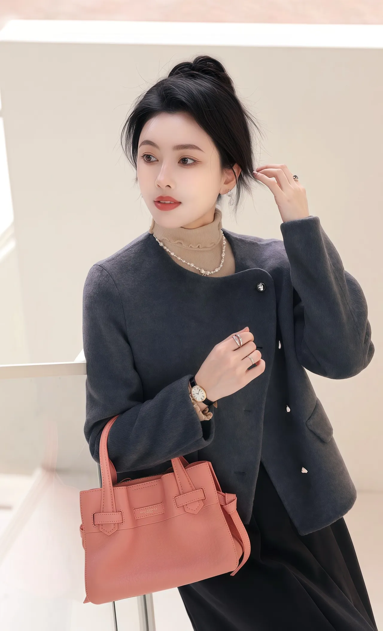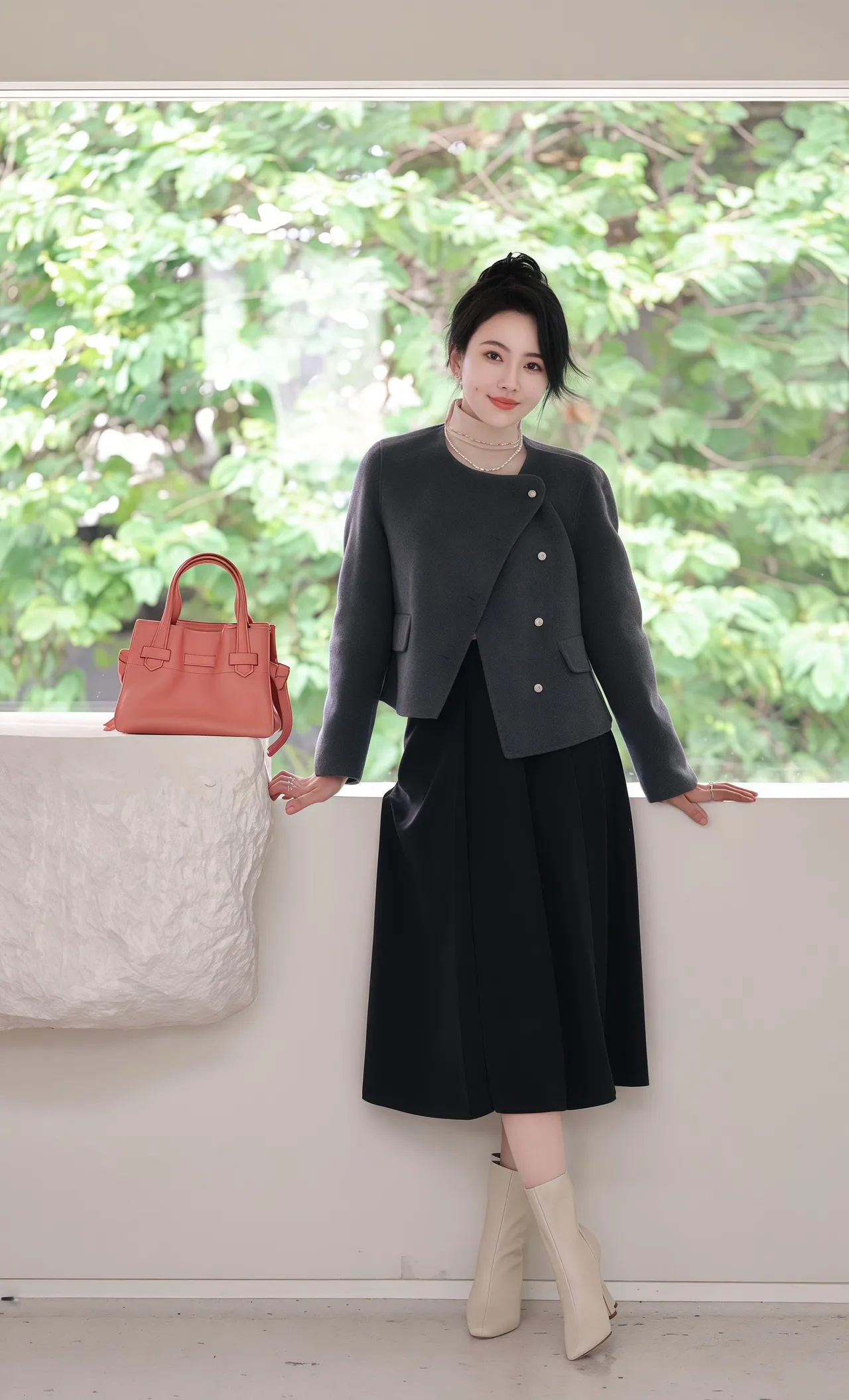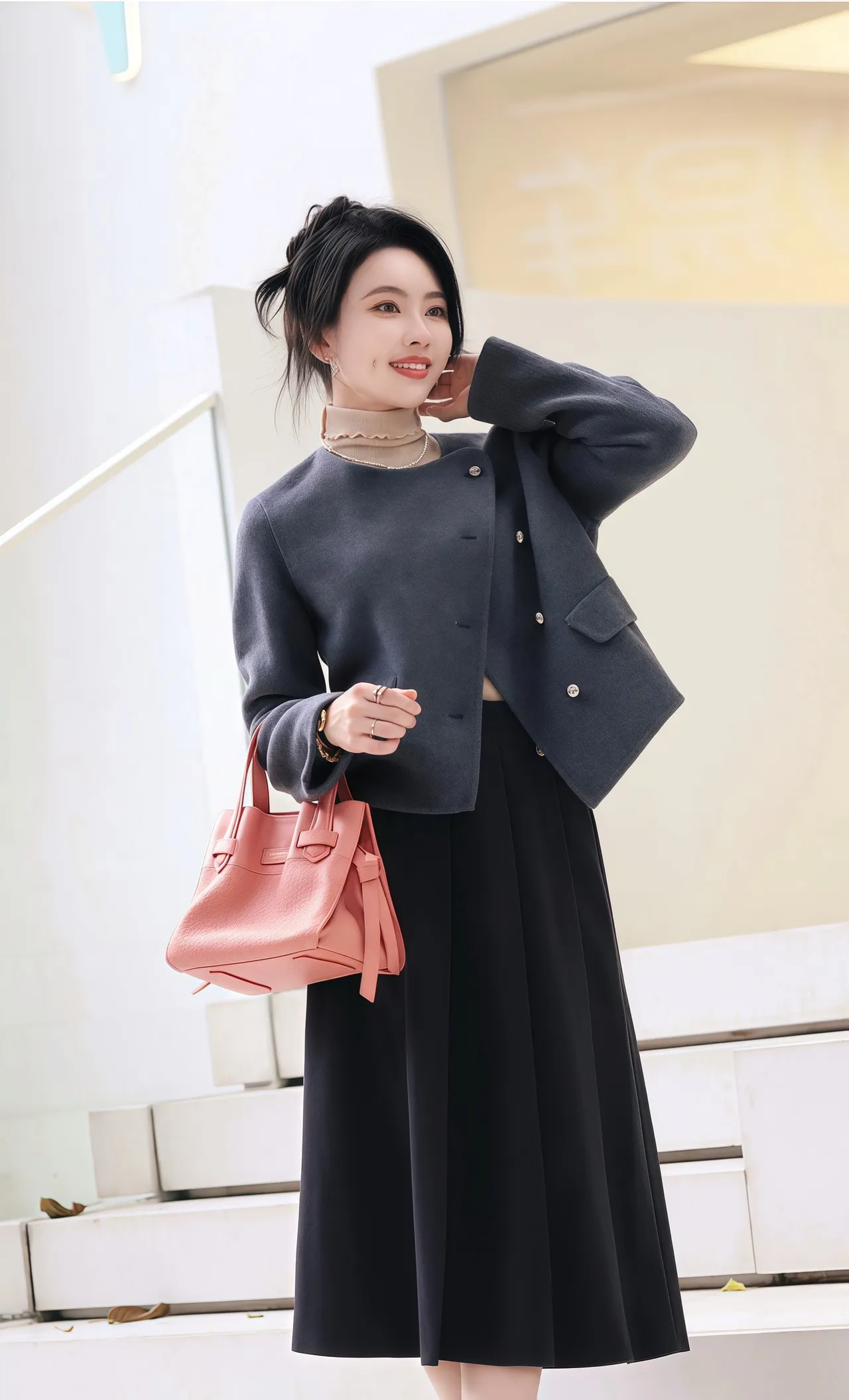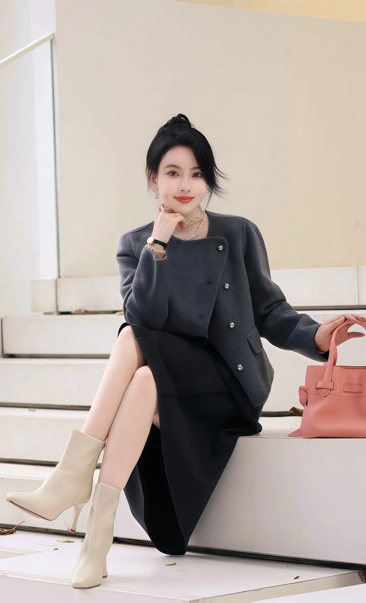 深灰色短款外套,是这套穿搭的质感担当。利落的剪裁贴合身形,又不会过于紧绷,凸显出穿着者的优雅姿态。不对称的纽扣设计为整体增添了几分设计感,打破了常规外套的单调,展现出独特的时尚品味。内搭的浅咖色高领打底衫,不仅保暖,还通过柔和的色调与外套形成对比,衬托出肤色的白皙,同时高领设计又自带一份端庄与温柔。