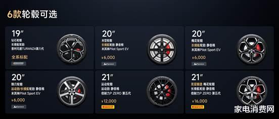新一代SU7全系提供6款轮毂选择,其中包含3款新轮毂,满足多样化审美需求。全新轮毂为19英寸钻石轮毂、20英寸锋刃轮毂和21英寸双层锻造梅花轮毂。其中21英寸的双层锻造梅花轮毂采用双层结构设计,经13小时铣削成型,使用22把专用单晶金刚石刀具,持续铣削6小时,精准勾勒龙鳞纹路,实现亮面连续、纹理清晰的高阶工艺表现。除此之外,还有经典的20英寸梅花轮毂、20英寸米型轮毂和21英寸运动轮毂可以选择。