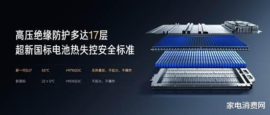 在热安全方面,新一代SU7电池包可以做到远超新国标的电池热失控安全标准:在55℃满电状态下,单电芯发生热失控时,系统可实现热失控不扩散、不起火、不爆炸。同时,全系标配行业最高ASIL-D安全等级电池系统,BMS电池管理系统可在突发情况下4ms内完成紧急断电,并通过24小时车云协同机制实现全天候安全预警。