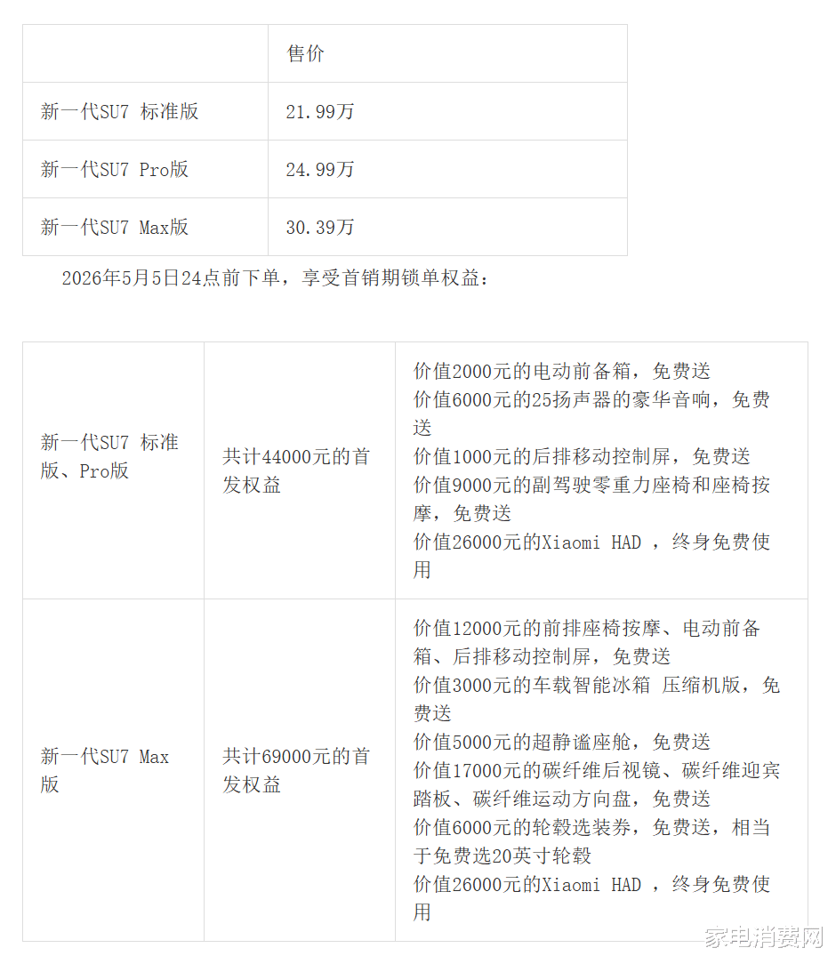 新一代SU7发布标准版、Pro版、Max版三个配置,售价21.99万~30.39万