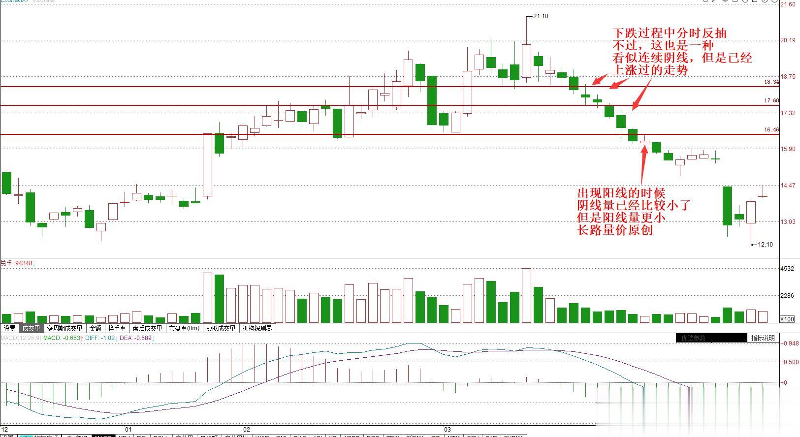 但是记住这里的一个关键是一直缩量下跌破位,而不是是有过反弹的,而这里的反弹不是 一定要出现大阳线才是反弹。