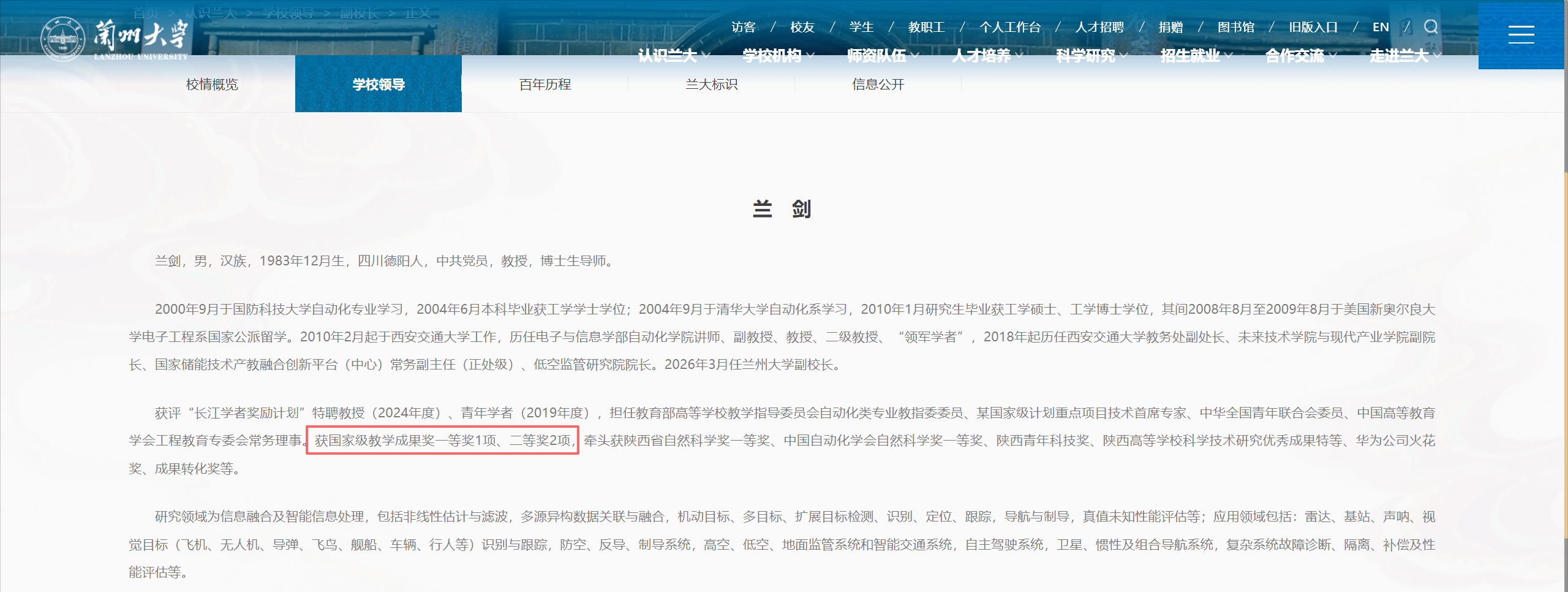 还有一个细节得留意,兰剑拿到过国家级教学成果奖一等奖1项、二等奖2项,并且还是教育部自动化类专业教指委委员, 这就说明他在本科教育改革方面也有自己的办法,不是那种只盯着科研不管教学的人,兰大作为首批实施基础学科拔尖学生培养试验计划的19所高校之一,教学改革也是挺有必要的事情。