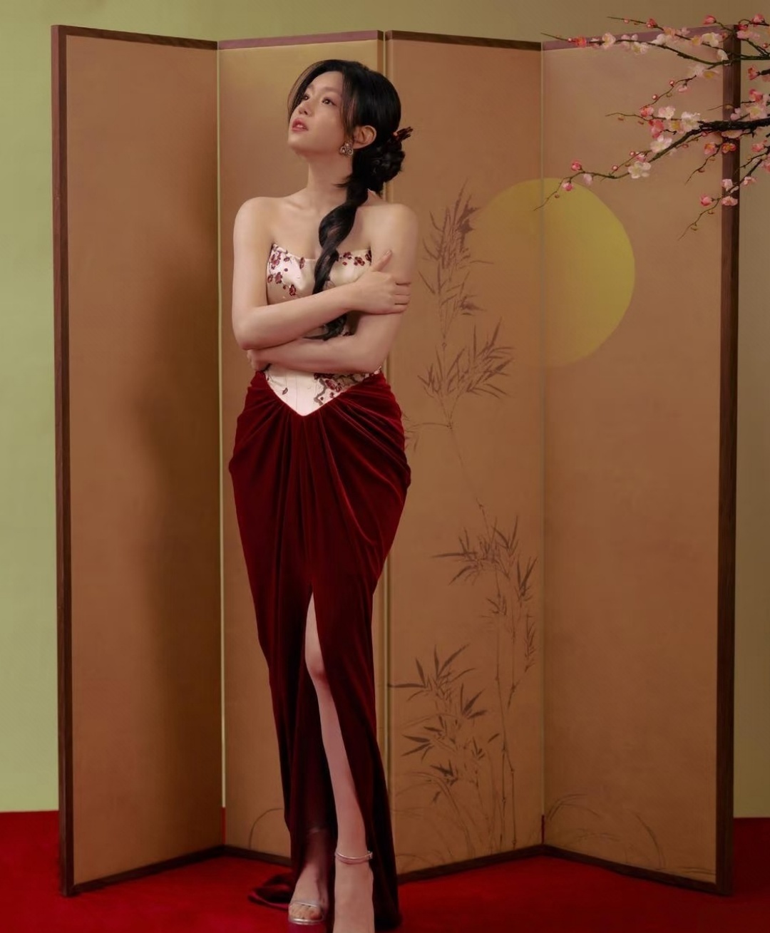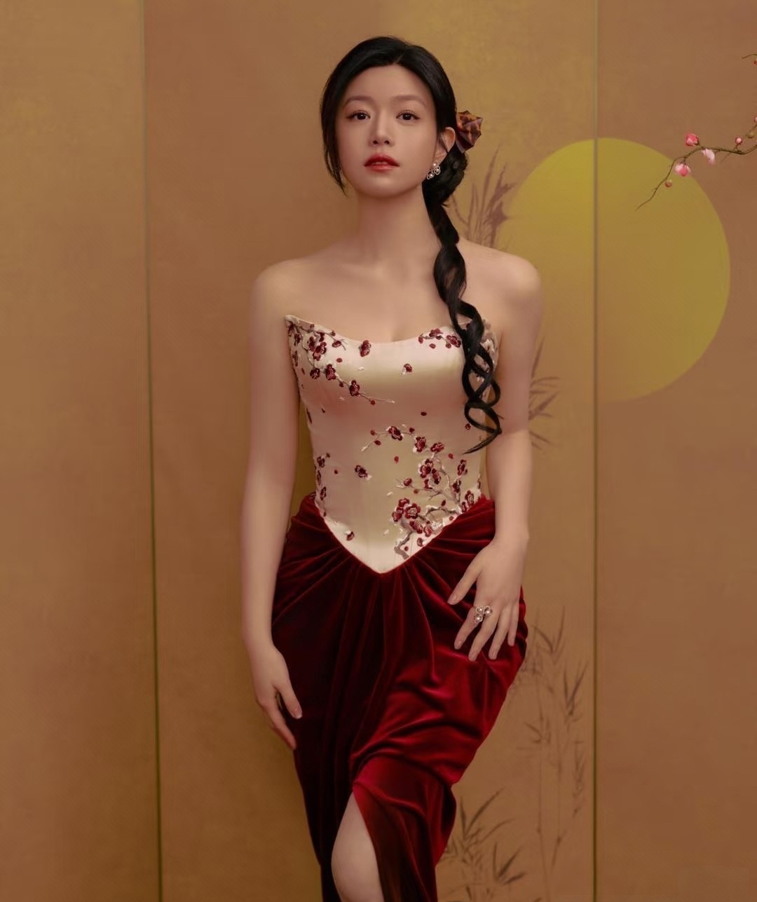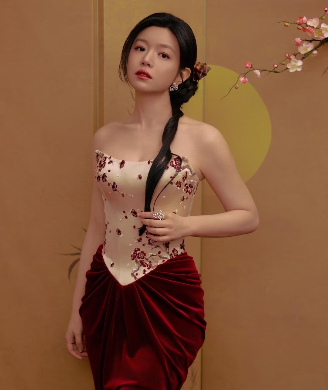 离婚后瘦了15斤不说,整个人的状态简直像被时光机送回了22岁。最新那套新中式造型绝了——白色抹胸配酒红丝绒长裙,腊梅绣在胸前开得正好,侧边麻花辫松松一扎,红唇一点。明明是该端庄的年纪,她却穿出了一股子轻盈的灵气。