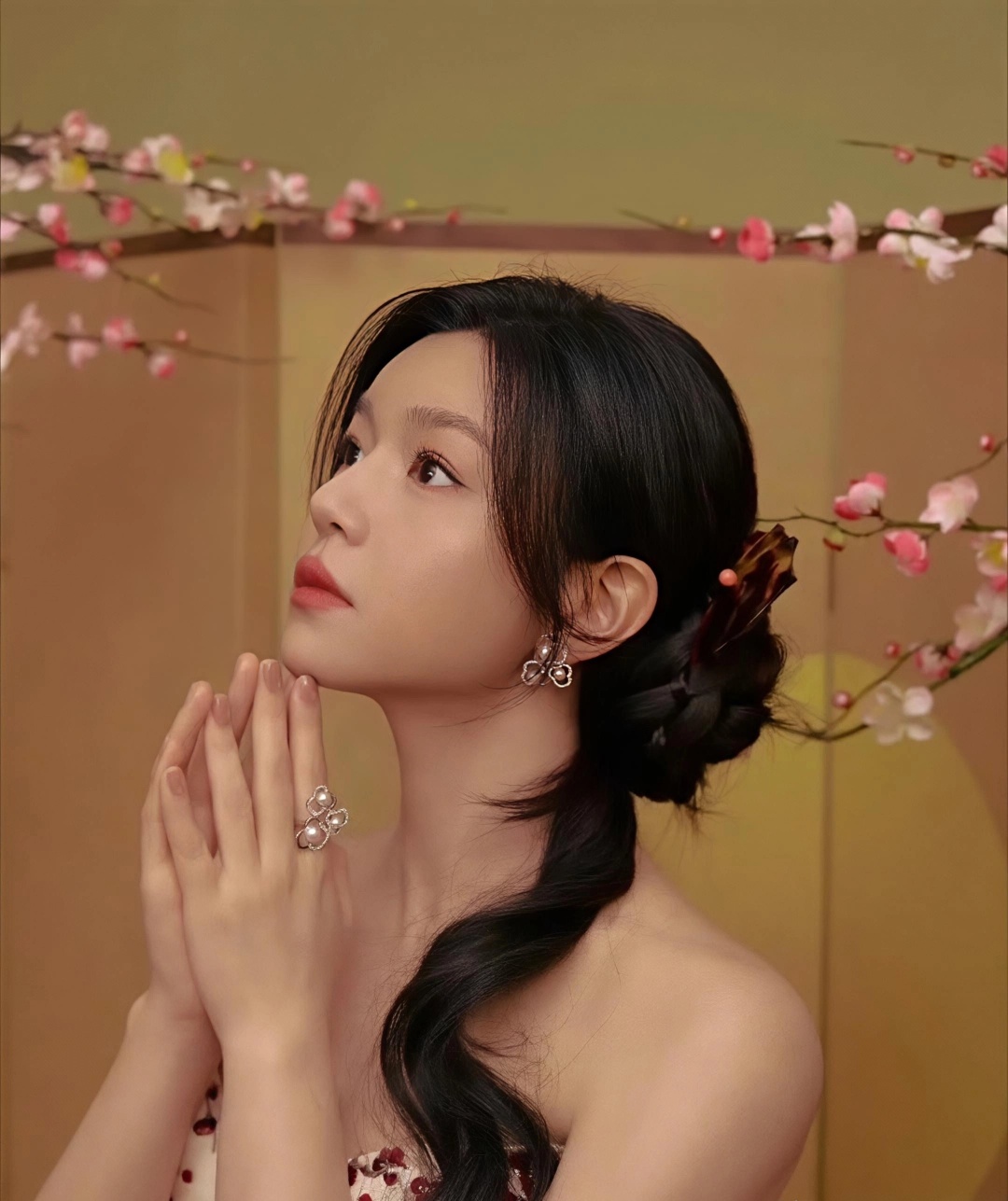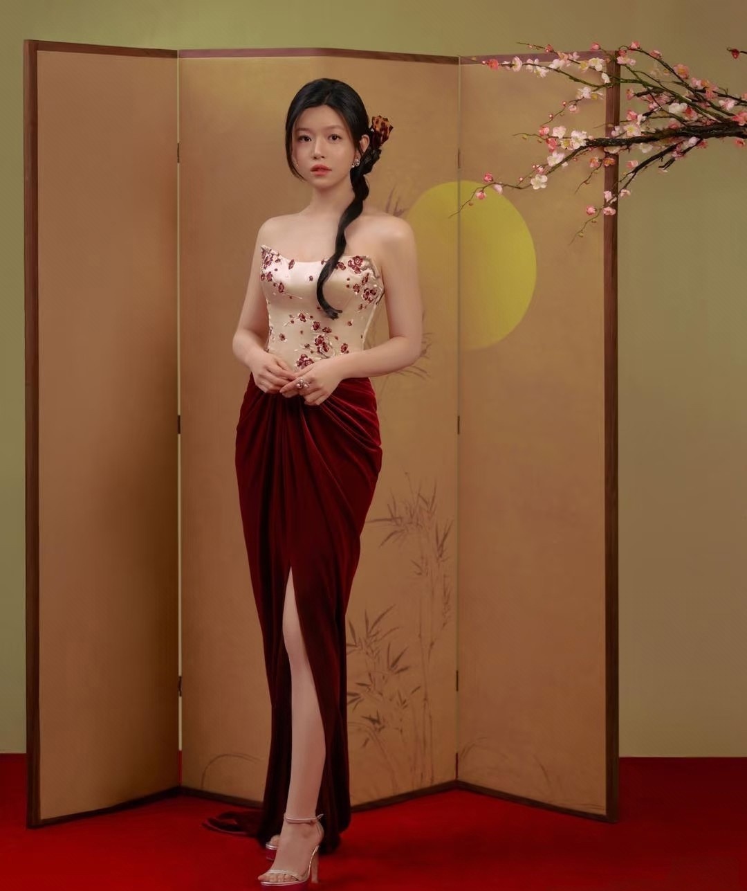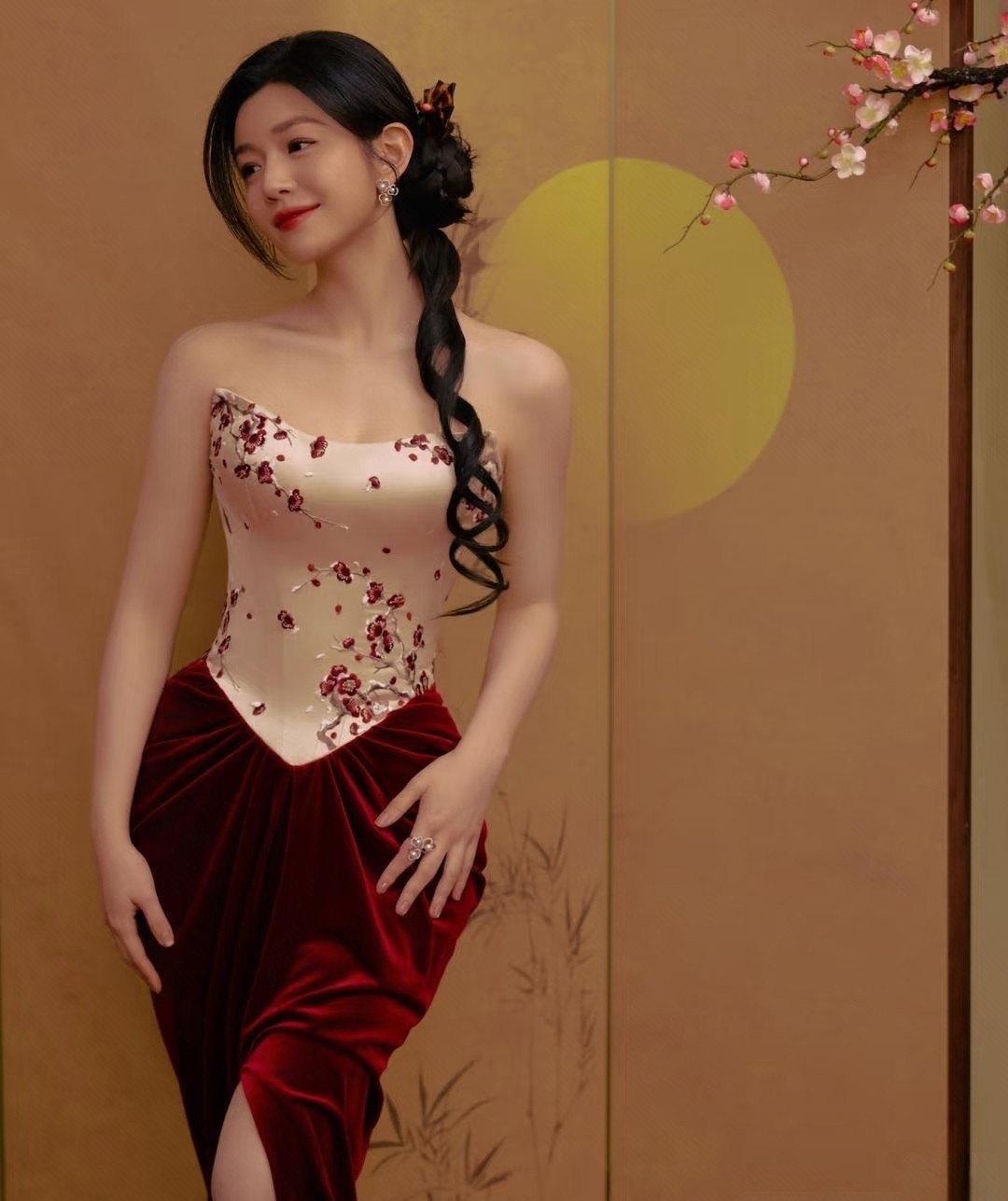 离婚后瘦了15斤不说,整个人的状态简直像被时光机送回了22岁。最新那套新中式造型绝了——白色抹胸配酒红丝绒长裙,腊梅绣在胸前开得正好,侧边麻花辫松松一扎,红唇一点。明明是该端庄的年纪,她却穿出了一股子轻盈的灵气。