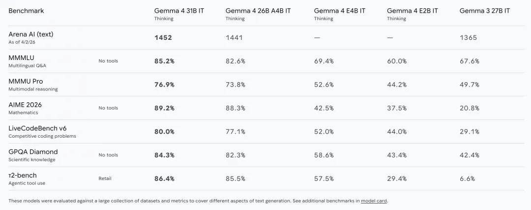 谷歌表示,Gemma 4 同时采用密集型架构和混合专家 (MoE) 架构,非常适合文本生成、编码和推理等任务。这些模型有四种不同的规模:E2B、E4B、26B A4B 和 31B。这些模型的大小各异,因此可部署在从高端手机到笔记本电脑和服务器的各种环境中,从而让更多人能够使用最先进的 AI。