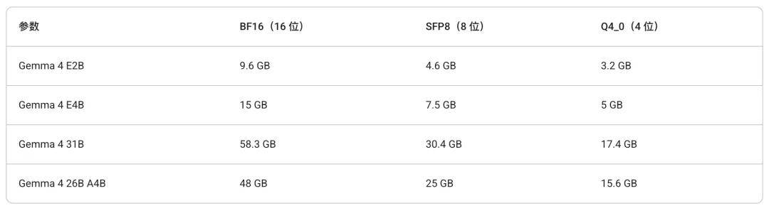 表 1. 加载 Gemma 4 模型所需的大致 GPU 或 TPU 内存,具体取决于参数数量和量化级别。