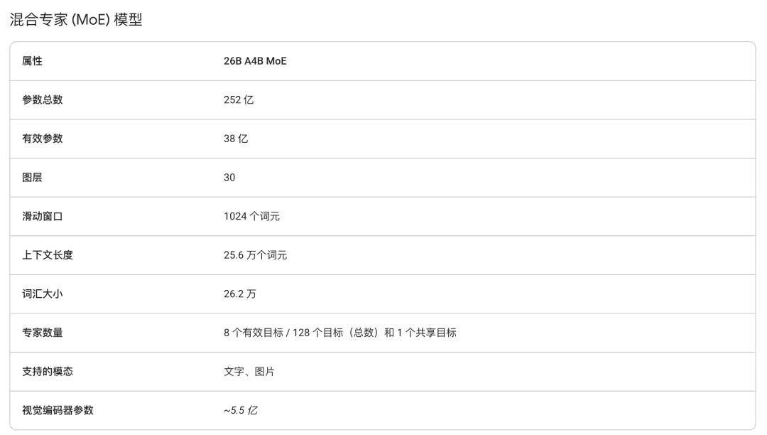 26B A4B 中的「A」表示「有效参数」,与模型包含的参数总数相对。通过在推理期间仅激活 40 亿个参数子集,混合专家模型运行速度比其 260 亿个总参数所暗示的速度快得多。与密集型 310 亿参数模型相比,该模型几乎与 40 亿参数模型一样快,因此是快速推理的绝佳选择。