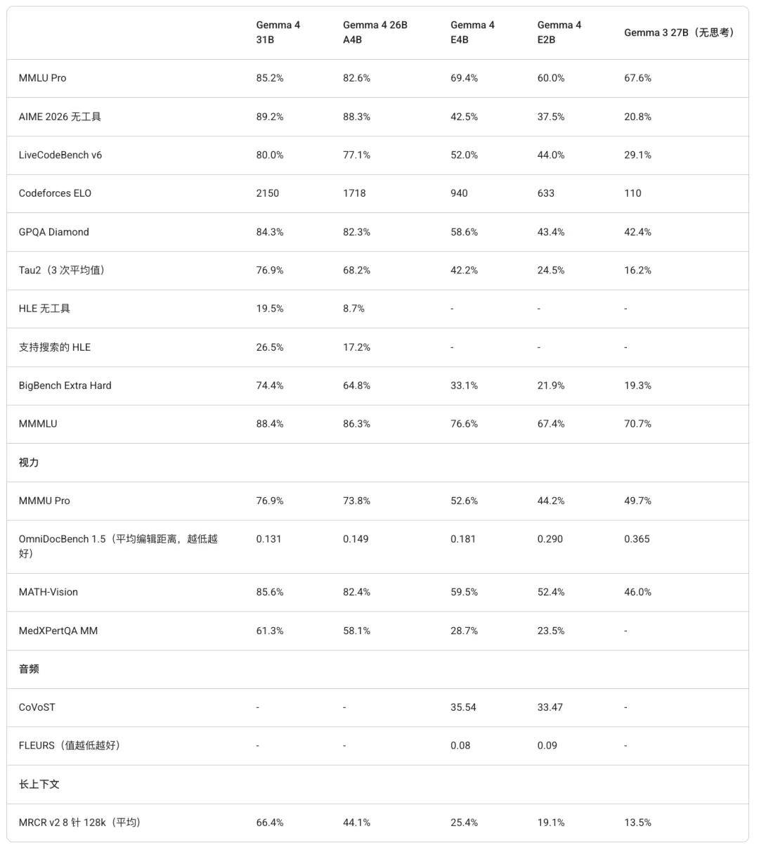 其中,体量最大的 31B 版本使用一块 80GB H100 就能实现完整精度推理,可见其能力水平已经与 Qwen 3.5 397B 相当了。