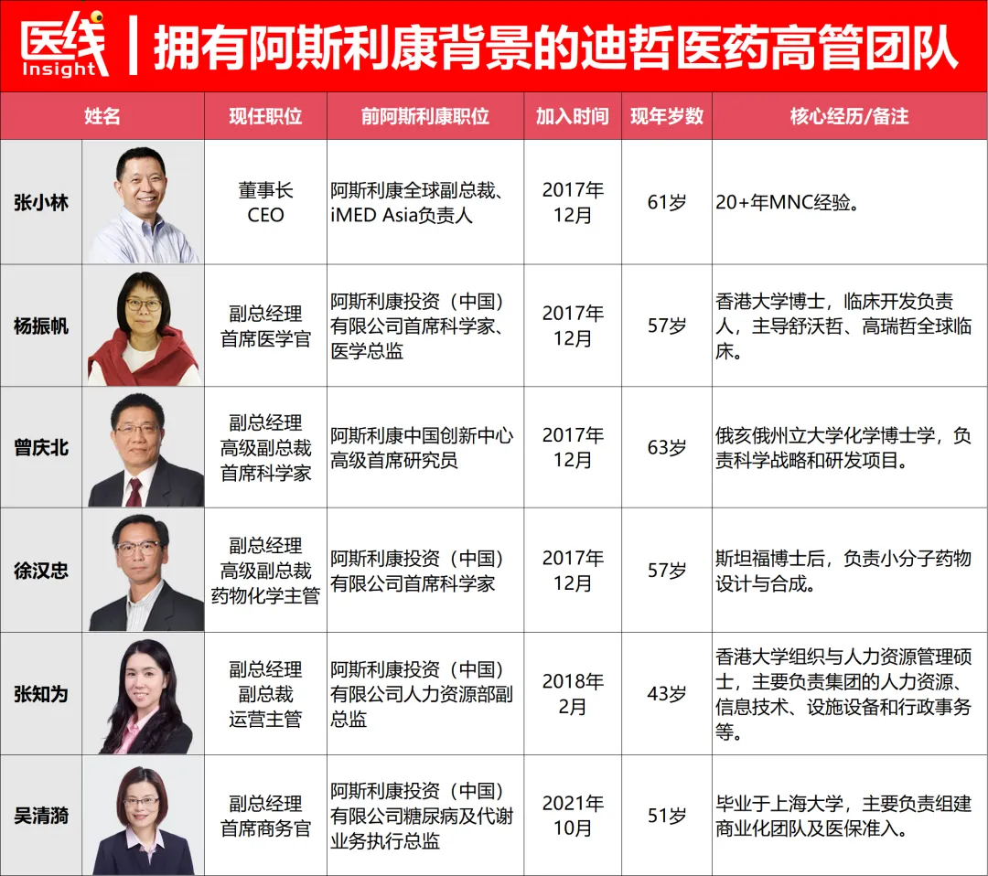 除了上述四位前同事,团队中大量核心成员均拥有在阿斯利康、辉瑞、礼来等全球制药巨头的长期任职经历。