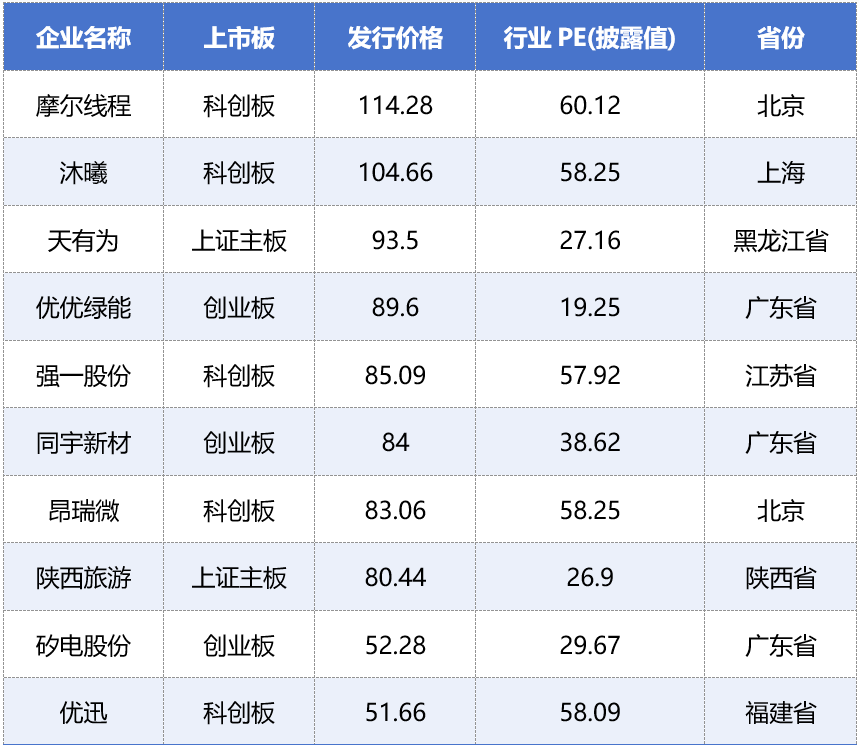 Wind数据显示,摩尔线程、沐曦股份、天有为、优优绿能等十家企业凭借高发行价跻身前列。