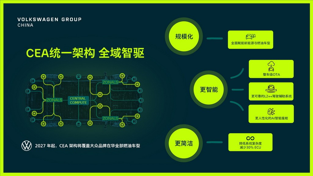 除了外观谍照透露的信息,新车的核心技术亮点同样值得关注。作为ID. AURA序列的首款车型,该车基于大众与小鹏联合开发的全新CEA电子电气架构打造,这套架构采用“中央计算+区域控制”的设计,大幅减少了ECU数量、简化了线束布局,不仅提升了系统稳定性,还降低了整车复杂度,让车辆响应更迅速、运行更安全,同时为整车全域OTA升级提供了坚实基础,支持整车全生命周期OTA升级,让智能驾驶、座舱交互的迭代速度匹配中国市场节奏。据悉,CEA架构仅用18个月就完成了从研发到量产的全链路贯通,创下大众同类项目的最快纪录,兼顾了中国速度与德系品质。