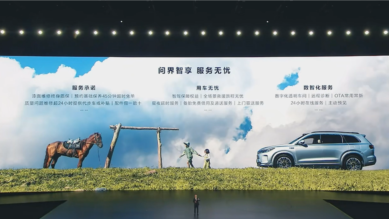 在此次发布会上,问界提出的“问界智享 服务无忧”涵盖了服务承诺、用车无忧和数智化服务三大维度。“服务承诺”包括漆面终身质保、基础保养45分钟超时免单、维修超24小时提供代步车及配件假一赔十等贴心保障;“用车无忧”则涵盖了智驾保障权益、全场景救援旅程无忧、星夜延时服务、备胎免费借用及递送服务等多项服务,让用户日常用车无忧。