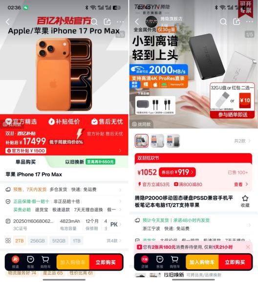 双十一换机选 iPhone 17 Pro 是优选(开售月余国内激活超400万台,Pro 系列占比近 80%),256GB版本足以应对日常需求。其搭载的前后双录、8K ProRes RAW、4 倍光学变焦三大功能,为视频创作者提供强助力,但 ProRes RAW 存储消耗极大。此时搭配腾隐P2000外置PSSD更合适,它质感(航空级铝合金机身,配色匹配 iPhone)、速度(2100MB/s 读取、1800MB/s 写入)在线,2TB版仅900元左右,比iPhone 17 Pro Max 2TB 版省超1.6万元,还支持多平台直连。选 “256GB iPhone 17 Pro+腾隐 P2000”,既能满足日常与创作需求,又能省下近 7000 元。
