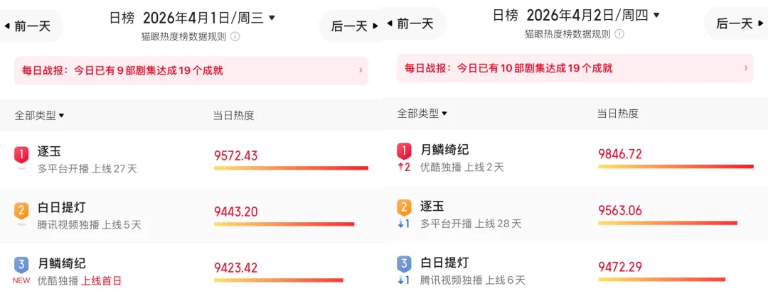 郭敬明的《月鳞绮纪》播了三天热度破万,最近落回9500。从剧情和演员表演看,被评像《大梦归离》2.0,看着奇情奇景,但内核小儿科,且有点黏腻。
